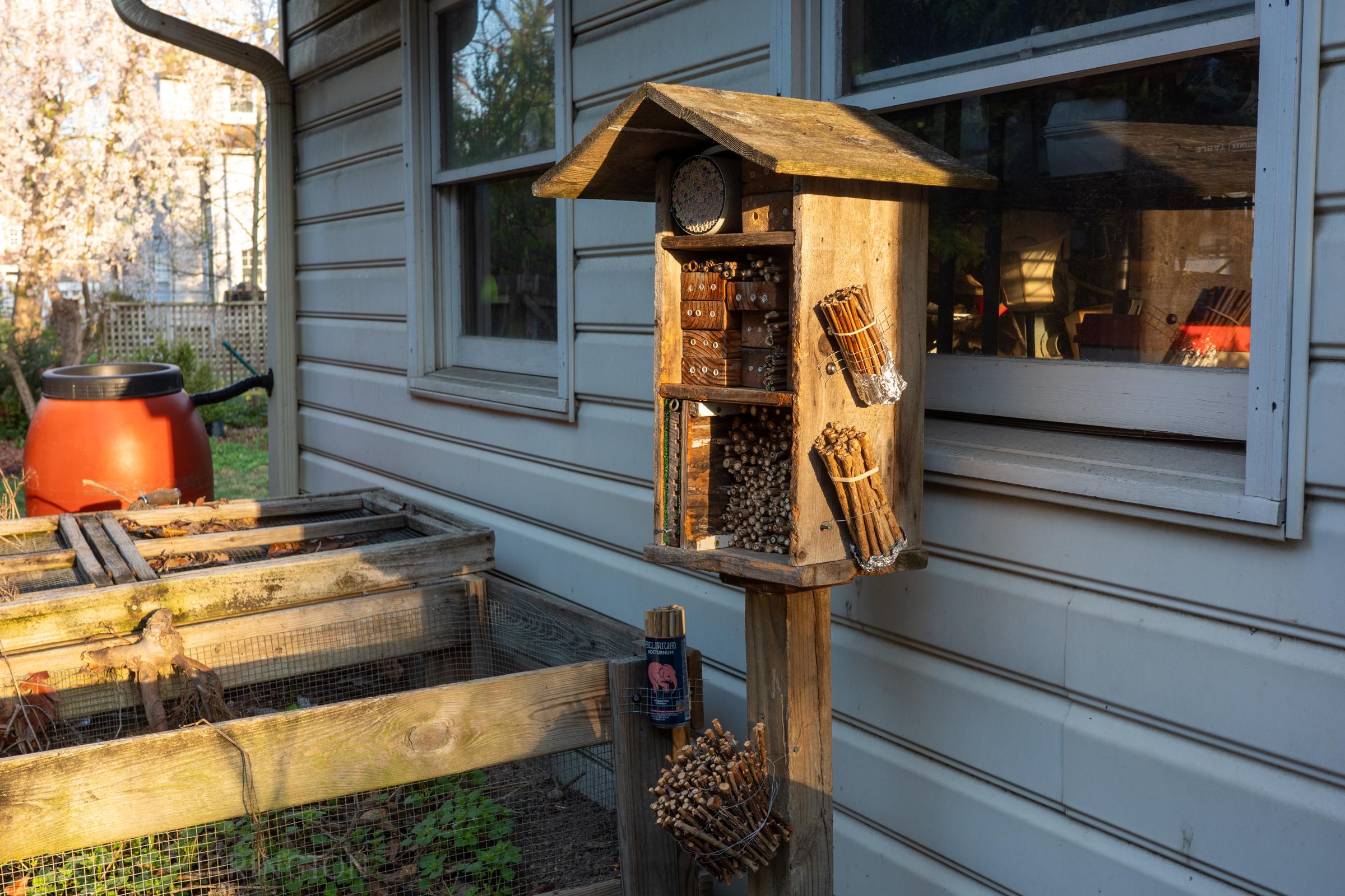 Morning light on the insect hotel and ADUs. No visitors yet, but I've seen male Osmia nearby so won't be long. New to the hotel this year are offerings of pithy stems (hydrangea, rose) to hopefully attract small carpenter bees (Ceratina) and digger wasps (Pemphredon). #InsectHotel #BeeHotel #bees #wasps #insects #hymenoptera #pollinators #biology