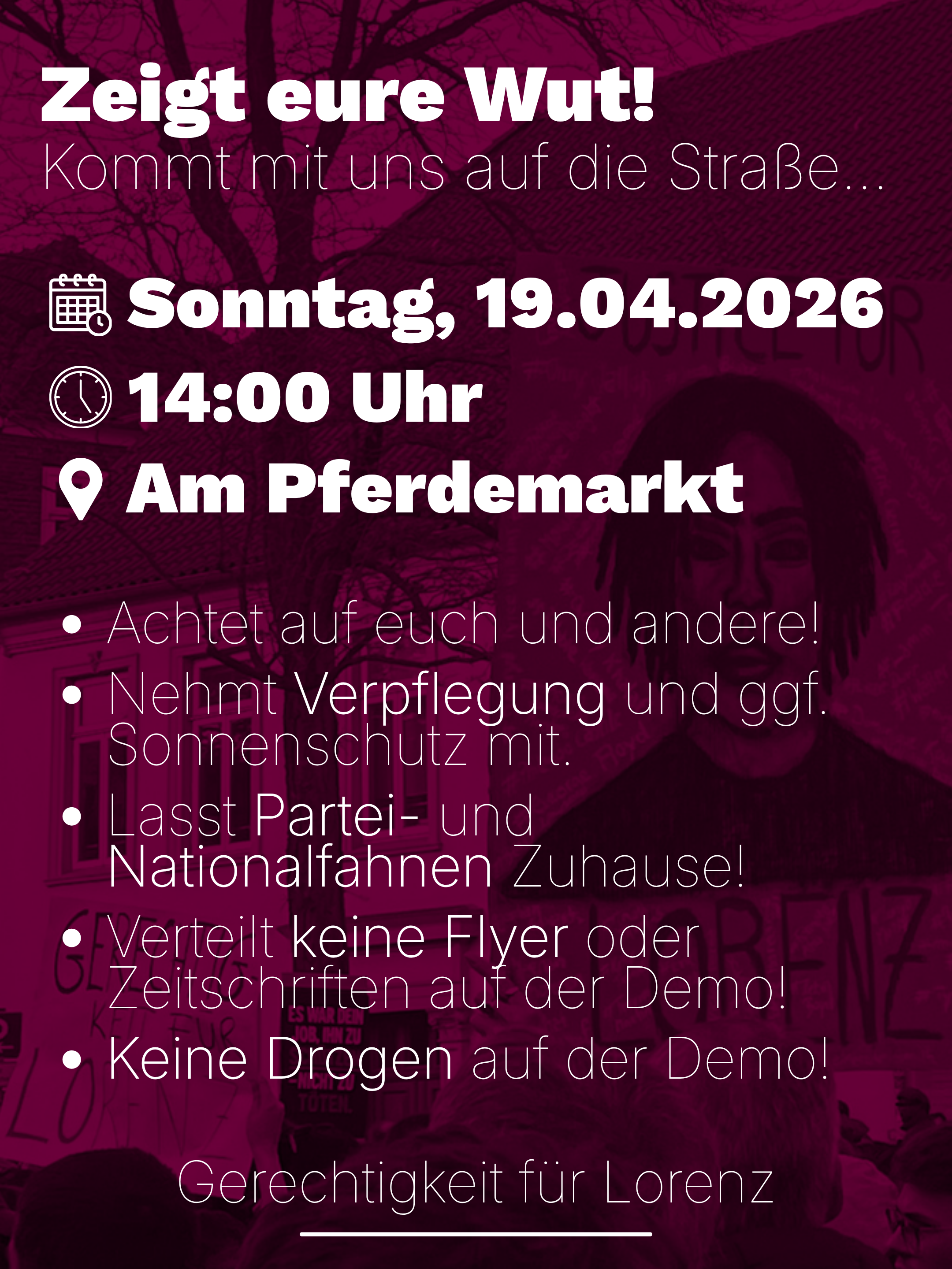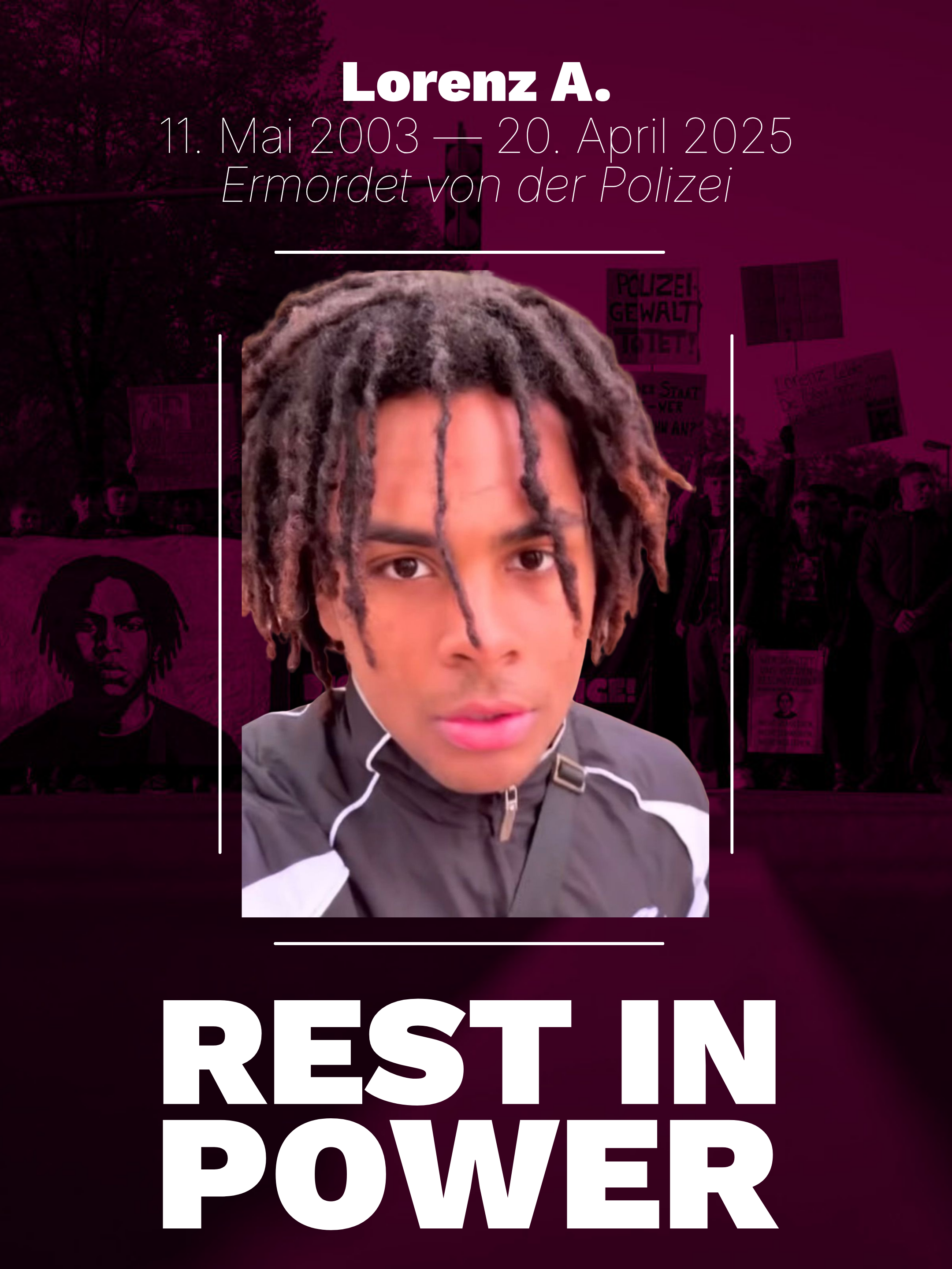 Dieses Wochenende jährt sich der Mord von Lorenz A. durch die Polizei das erste Mal. Deshalb gehen wir gemeinsam auf die Straße und demonstrieren, erinnern, kämpfen! 🚩
