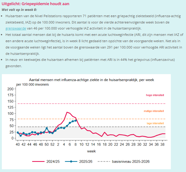Met een griepepidemie die aanhoudt, maar we zien wel een afvlakking. Vergeleken met vorig jaar zien we een latere en naar het nu zich laat aanzien ook een kleinere griepepidemie. Of hij ook korter zal duren valt nu nog niet te zeggen.