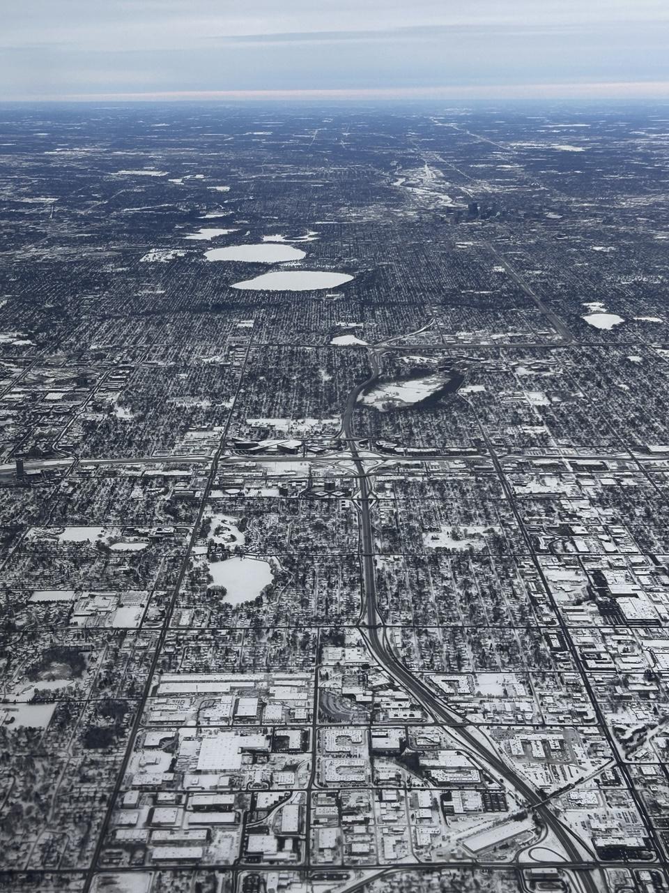 Aerial view of a snow covered and frozen #Minneapolis #Minnesota looking north. Two larger lakes in the background are Harriet and Bde Maka Ska. The dark smudge a little further and to the right is downtown.