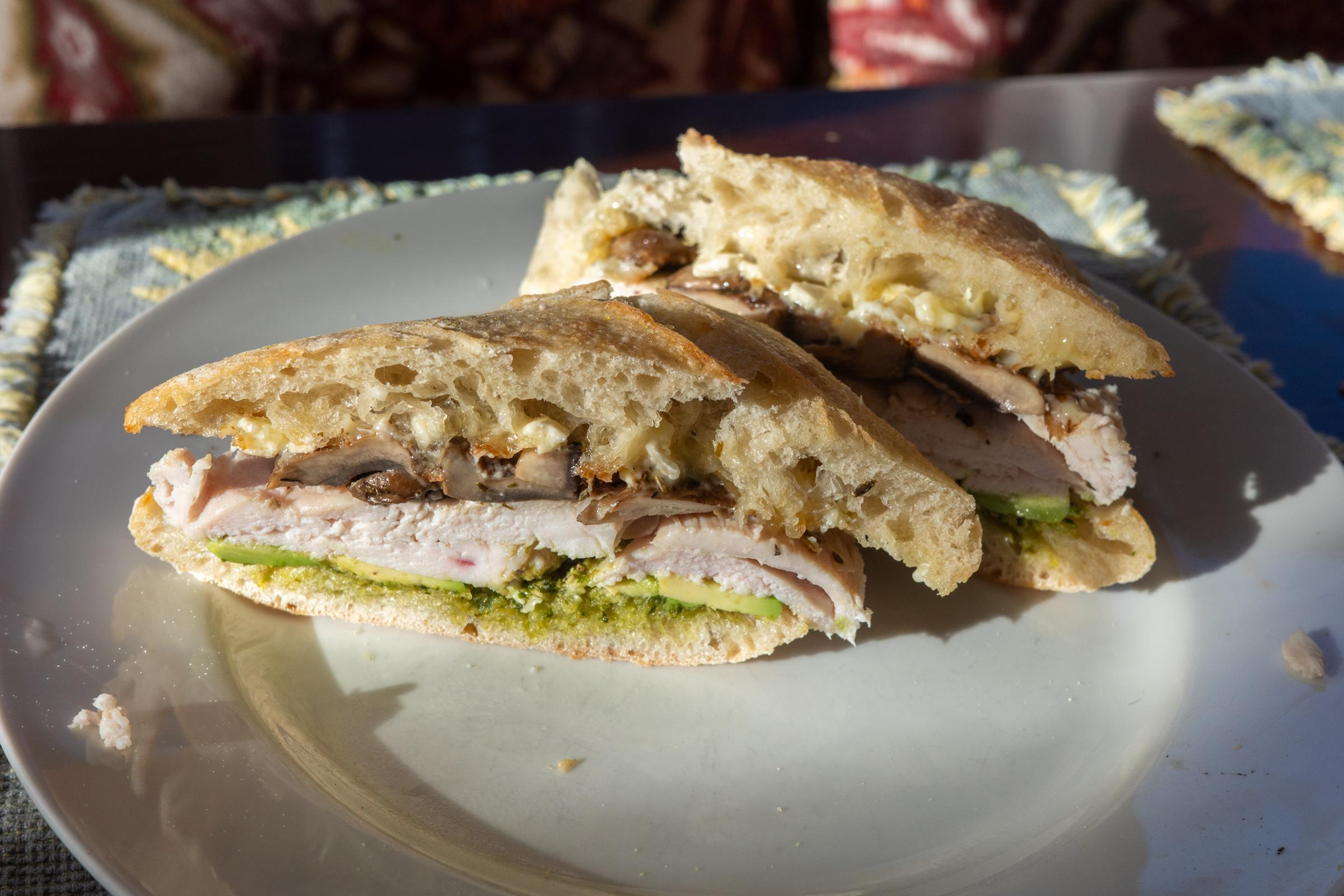 Chicken, mushrooms, brie, avocado, pesto, and herbs de Provence on a grilled ciabatta. It's a recreation of my favorite sandwich at Chez Yasmine, a Philadelphia-based food truck that sometimes came to Swarthmore during the summer. The chef, Jihed Chehimi, was a former scientist. #sandwich #food #philadelphia #swarthmore