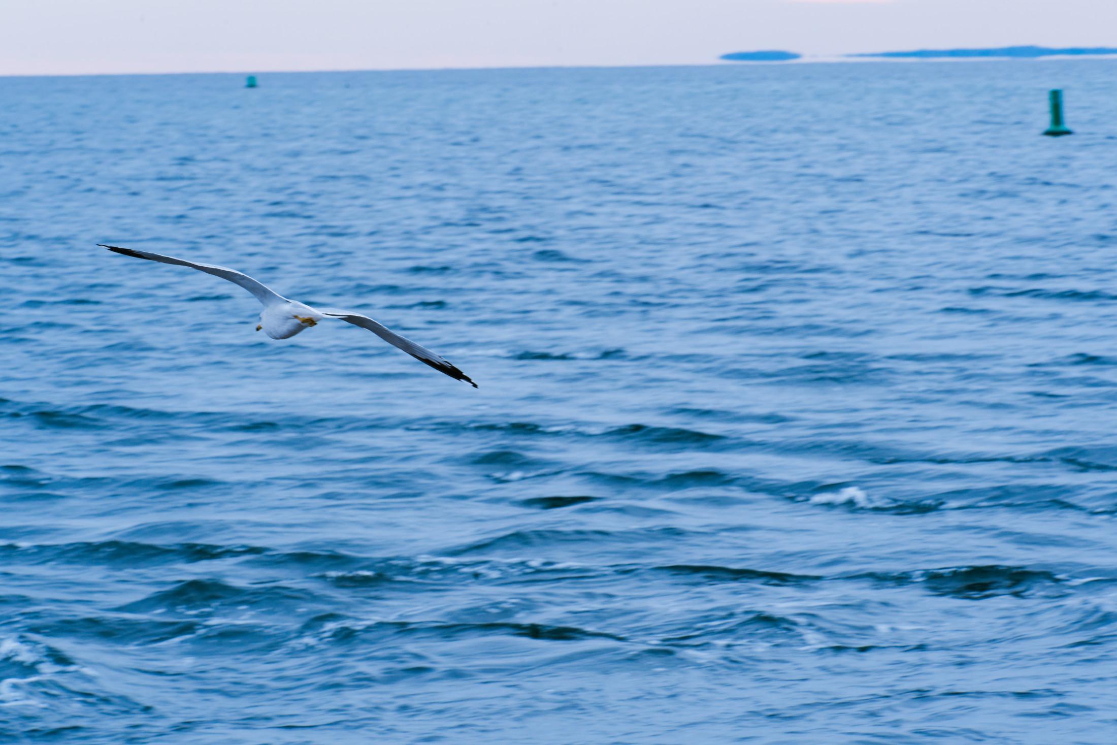 Seagull rides ground effect near the ocean at Hampton Beach, NY
