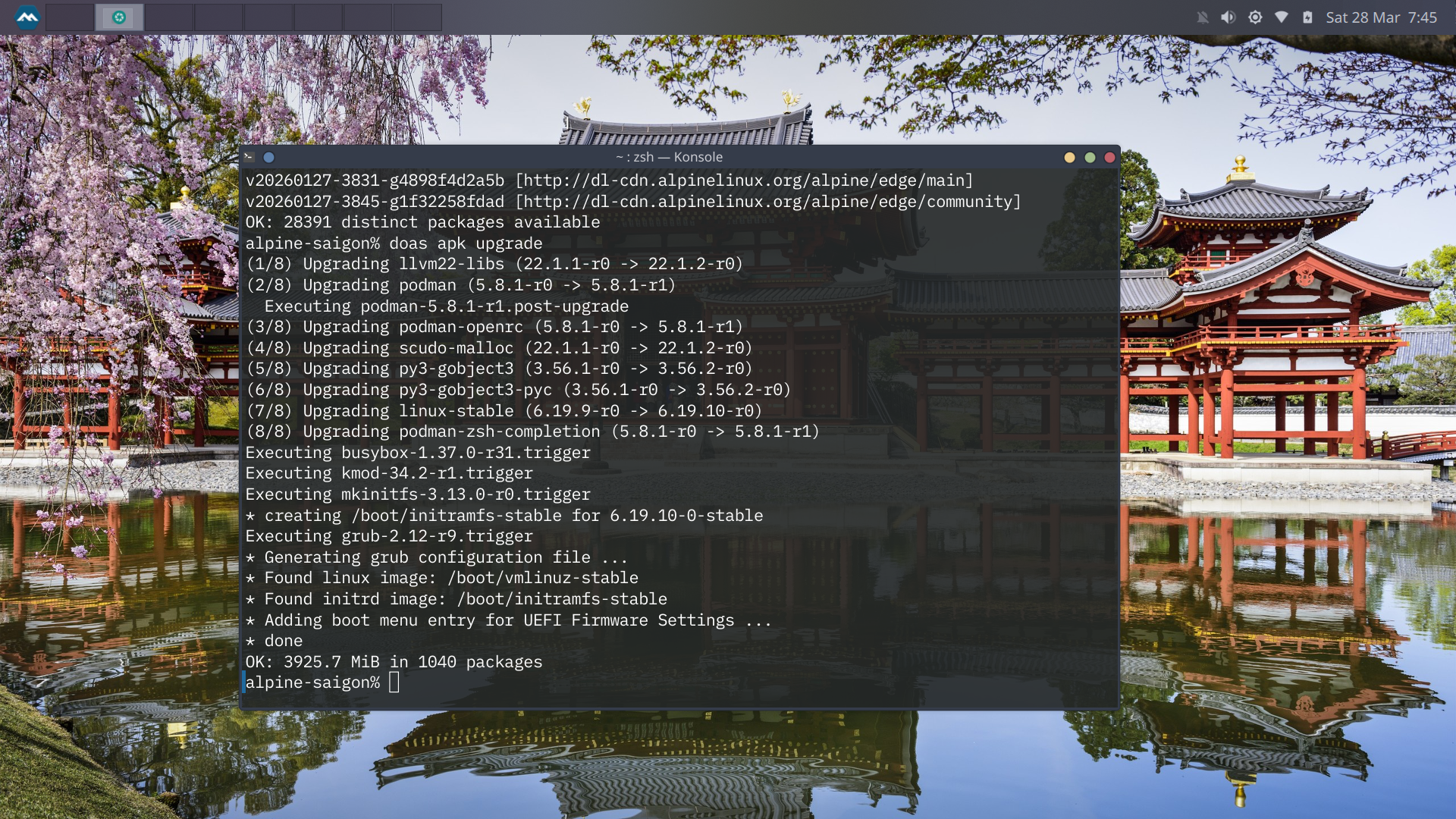 As said before musl-based AlpineLinux really rocks. Of course running all required stuff, like a full KDE session, a firewall and podman (for distrobox), flatpak for all 'bigger' applications and still clocking in at 903Mb. For me that shows how lean everything has been put together. Cool.
