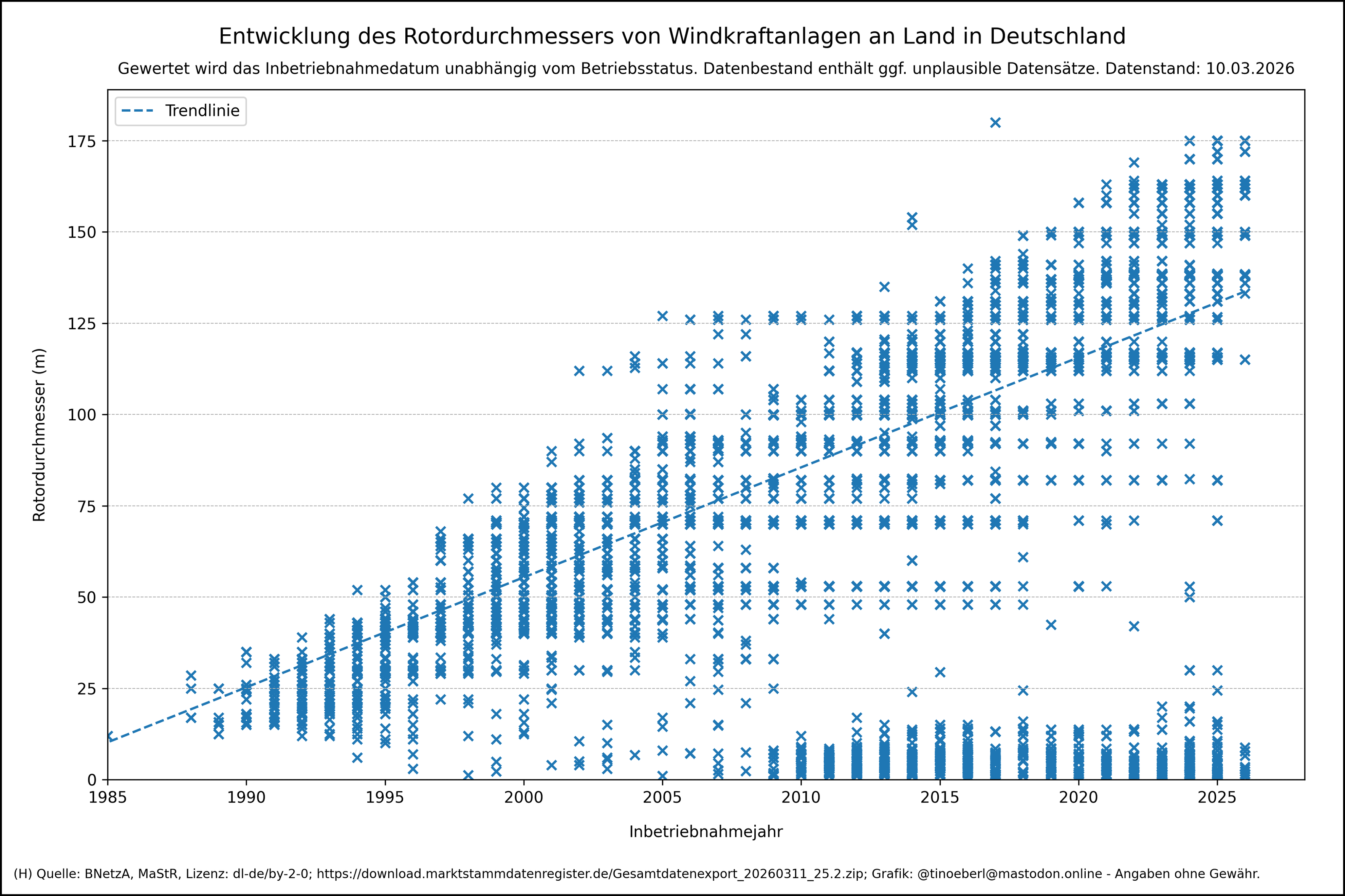 Entwicklung des Rotordurchmessers von #Windkraftanlagen an Land in #Deutschland mit Stand vom 10.03.2026.