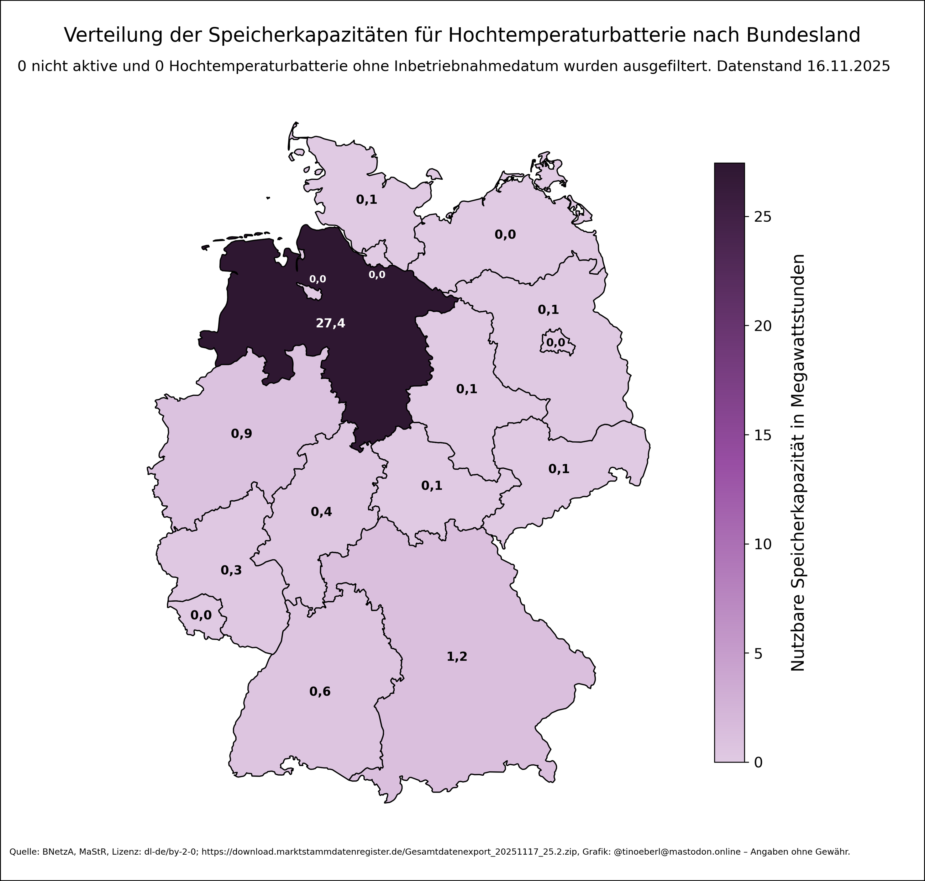 Verteilung der #Speicherkapazitäten für Hochtemperaturbatterien nach Bundesland in #Deutschland mit Stand vom 16.11.2025.
