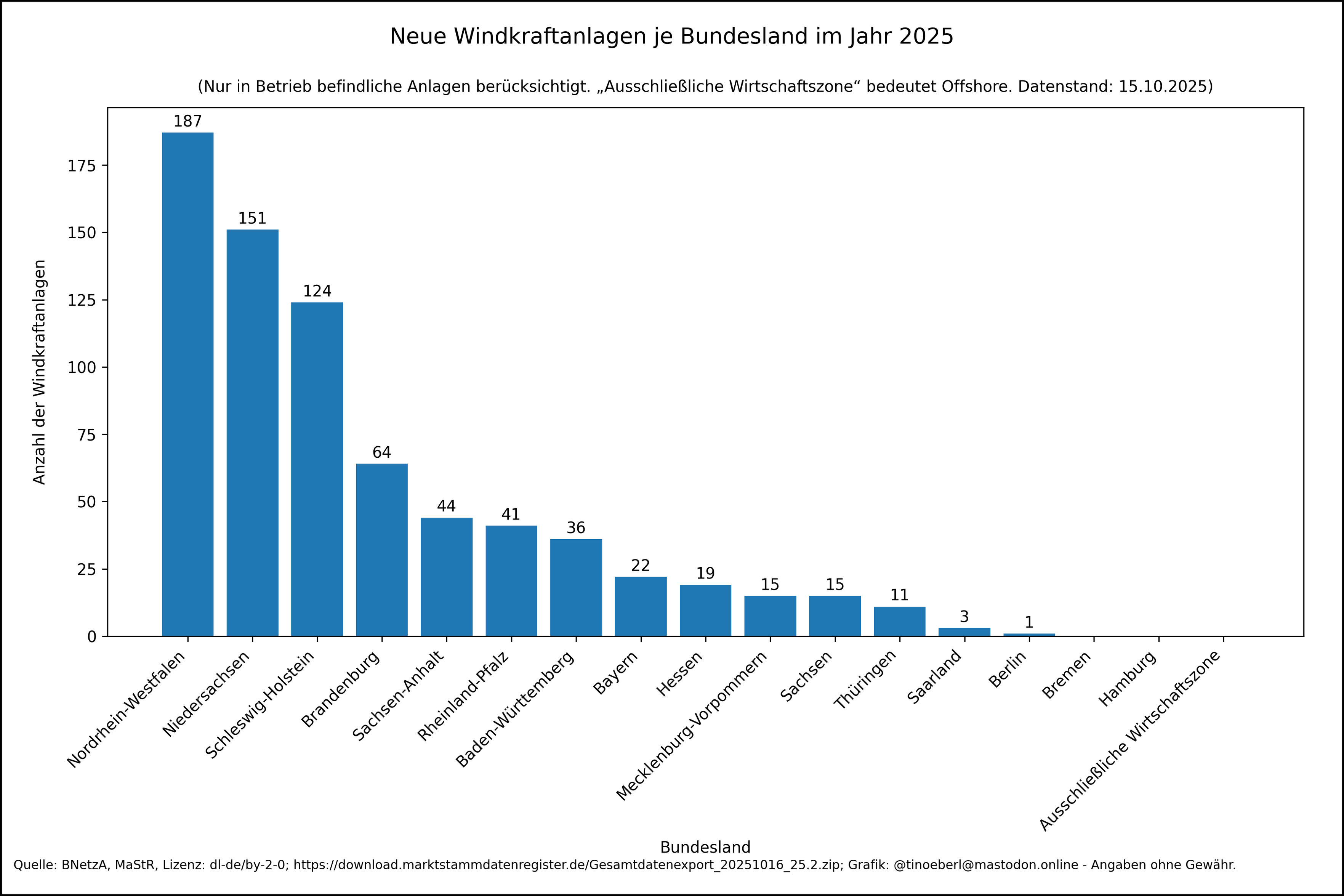 Anzahl der neuen #Windkraftanlagen je #Bundesland in #Deutschland im Jahr 2025 mit Stand vom 15.10.2025.