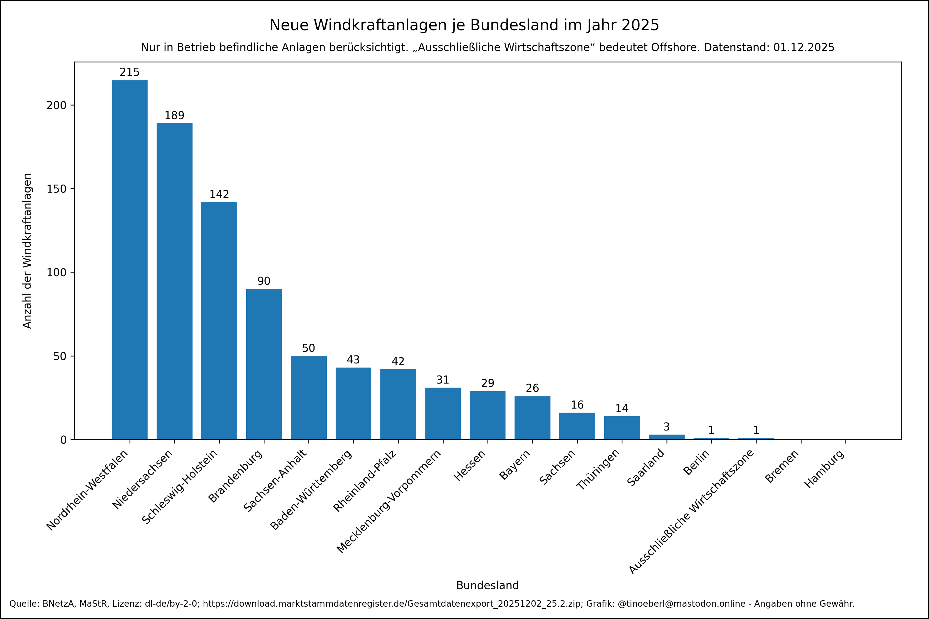 Anzahl der #Windkraftanlagen je #Bundesland in #Deutschland mit Stand vom 01.12.2025.