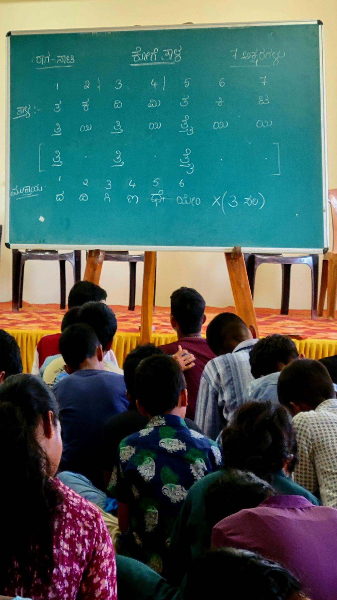 The chalkboard shows a basic 7 beats rhythm ("thaala") and melody ("raaga").The text is written in #Kannada.