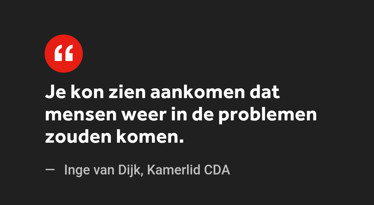 "Een pauzeknop betekent niet dat je die ouders financieel kan loslaten", vindt CDA-Kamerlid Inge van Dijk. "Ik vind dat je eigenlijk op voorhand kon zien aankomen dat mensen weer in de problemen zouden komen."