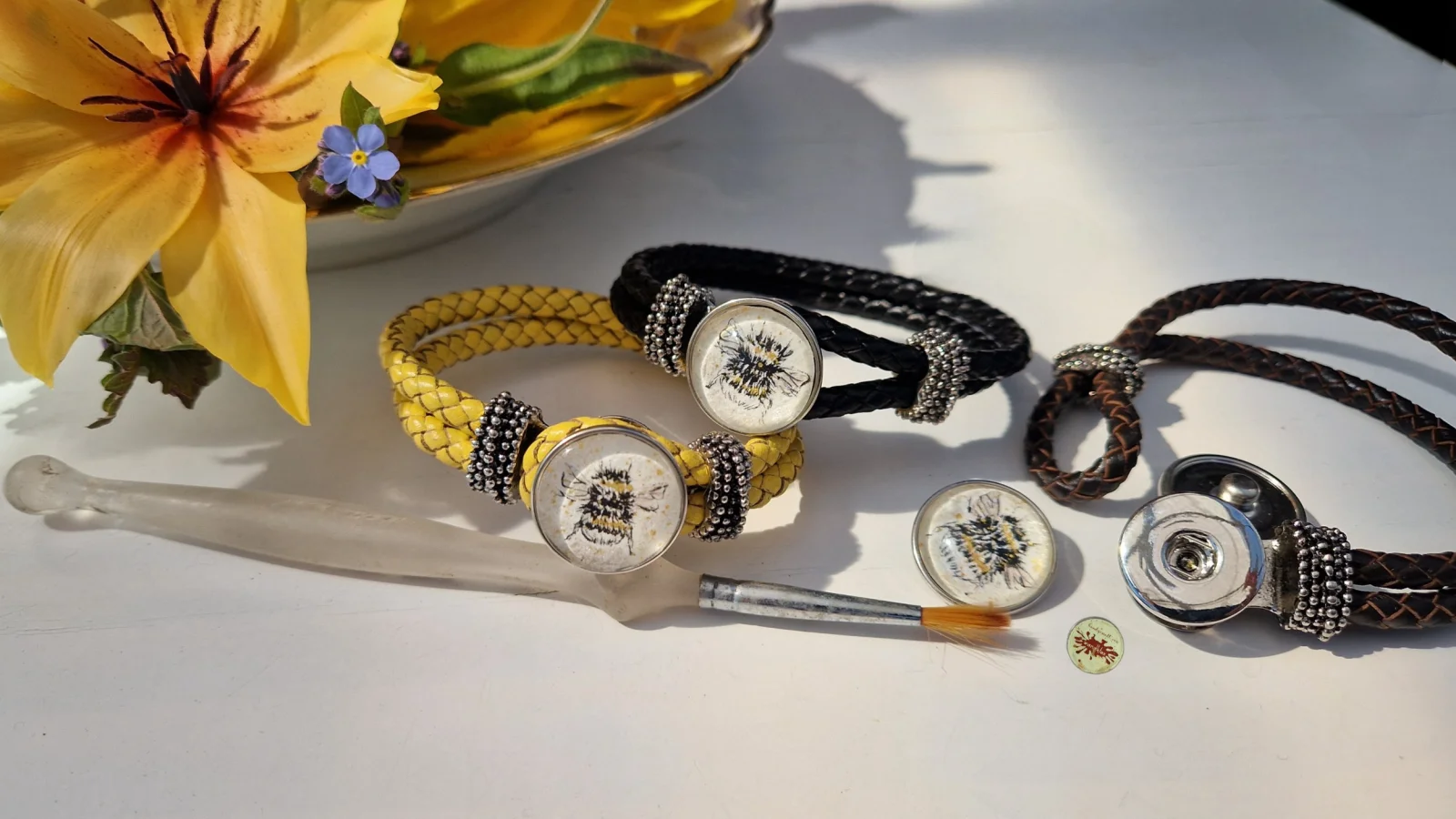 ...und da es mehrfach für eine Bestellung angefragt wurde, gibts jetzt dieses #wandklexschmuck Hummelmotiv auch als handgemalte 20mm-Druckknopfversion (so ebenfalls seit gerade eben auf #miniaturepainting#bumblebee #fediArt #mastoARt #creativeToots #artForSale