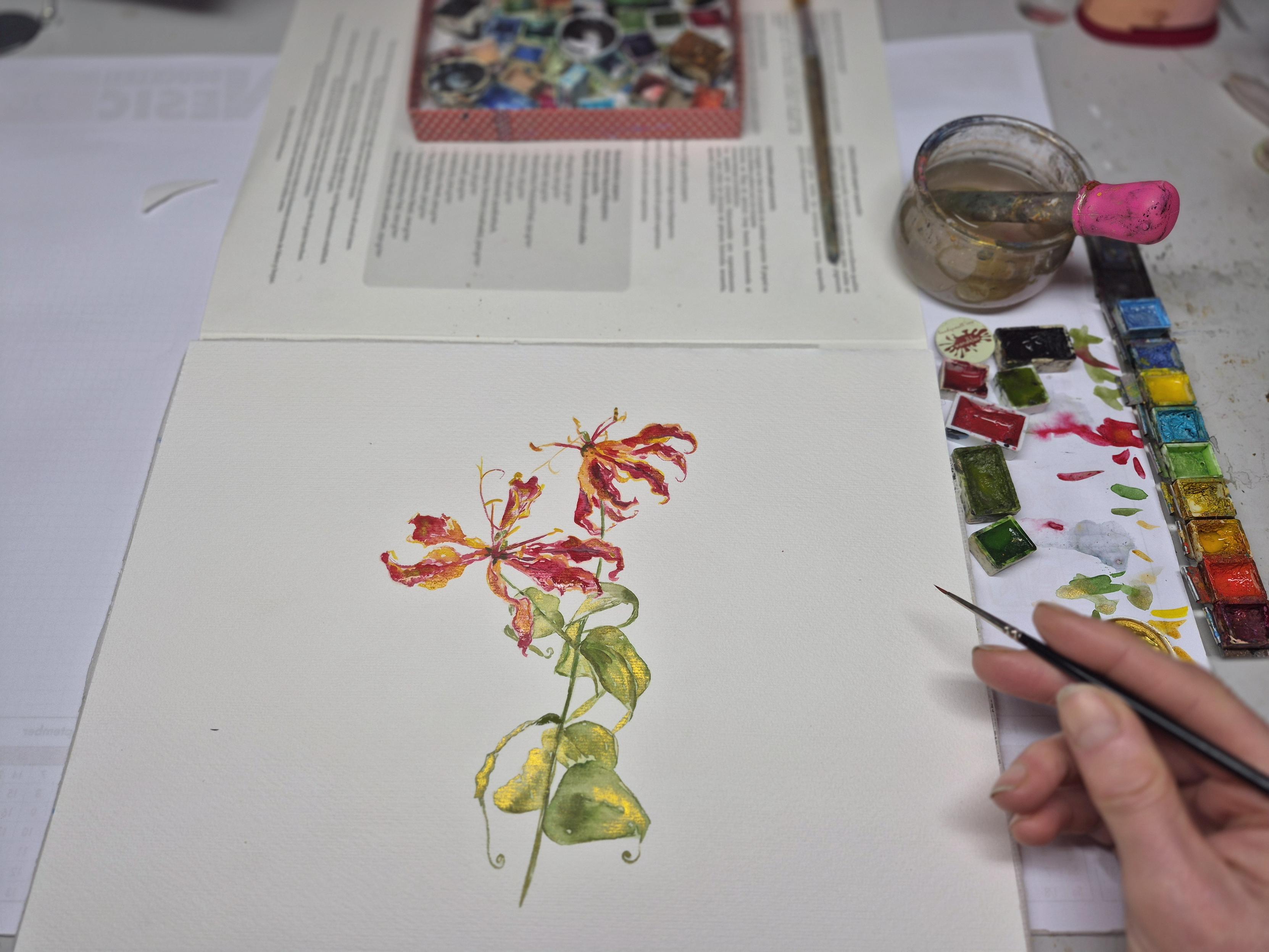 Auch wenn sie bei mir mangels Idealbedingungen gar nicht gedeihen Gloriosas gehören mit zu meinen Lieblingsblüten. Da kann man schon mal alle 7 Jahre eine malen (so lang ist die letzte her.)
