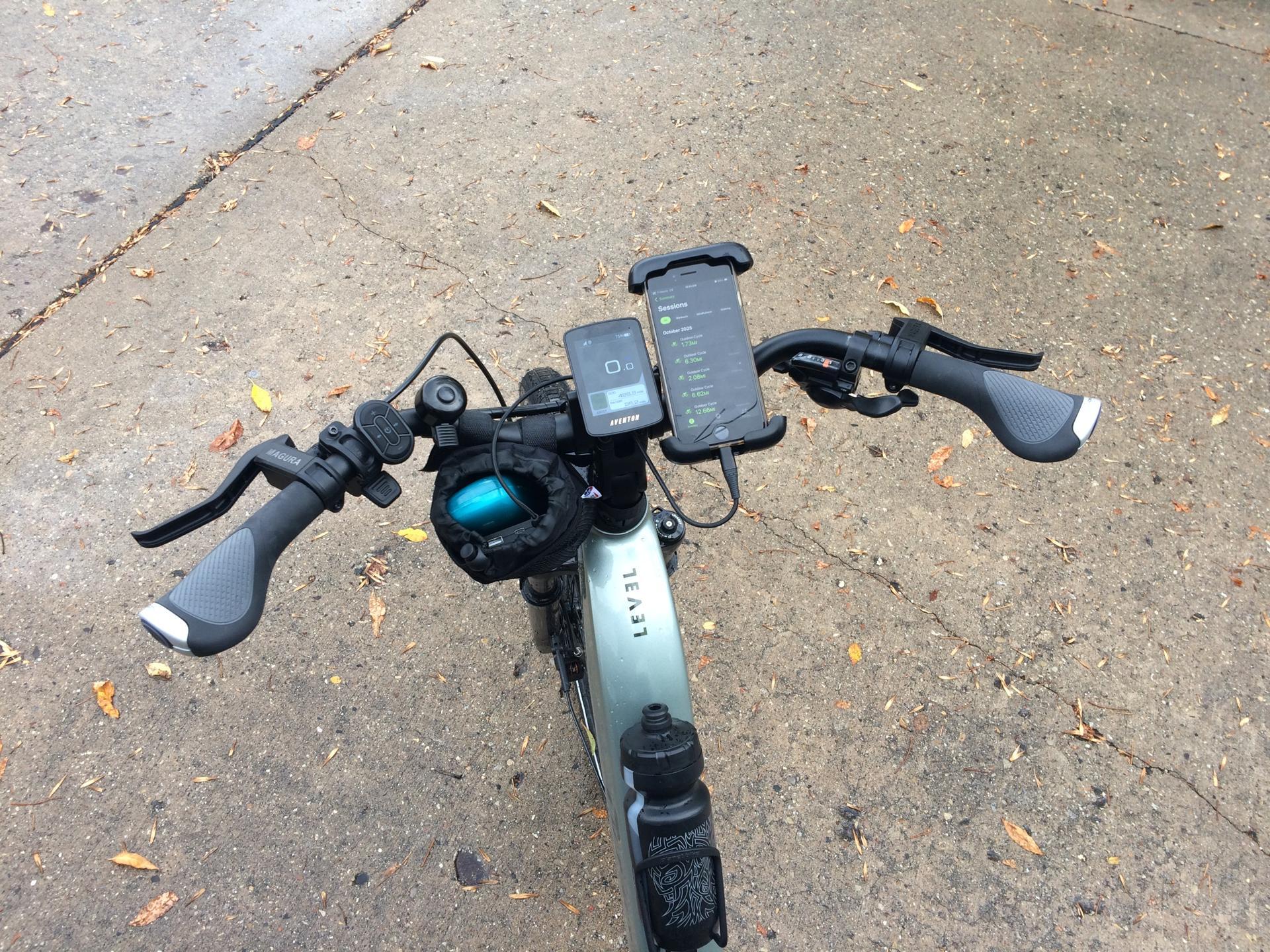 Since it was raining I spent some time in the garage doing a handlebar upgrade. Went with a bars that are slightly more swept back than the stock Aventon Level 3 bars. I just wanted a little more upright riding position. Pretty easy swap, took about an hour, may have lost one little tiny screw.