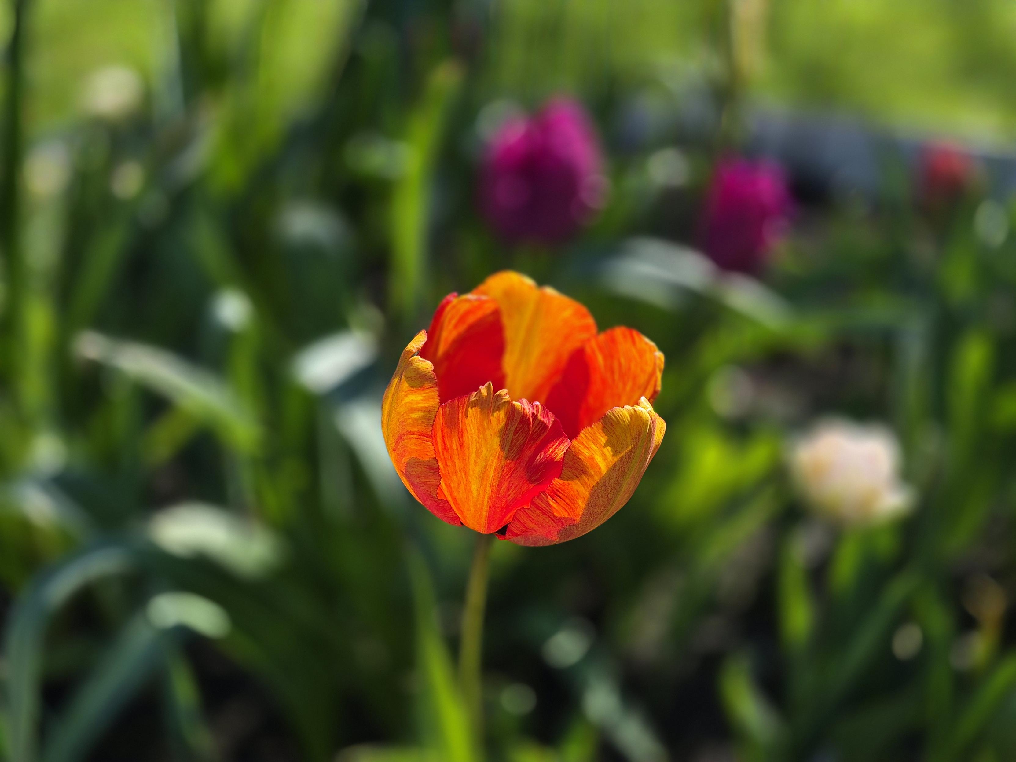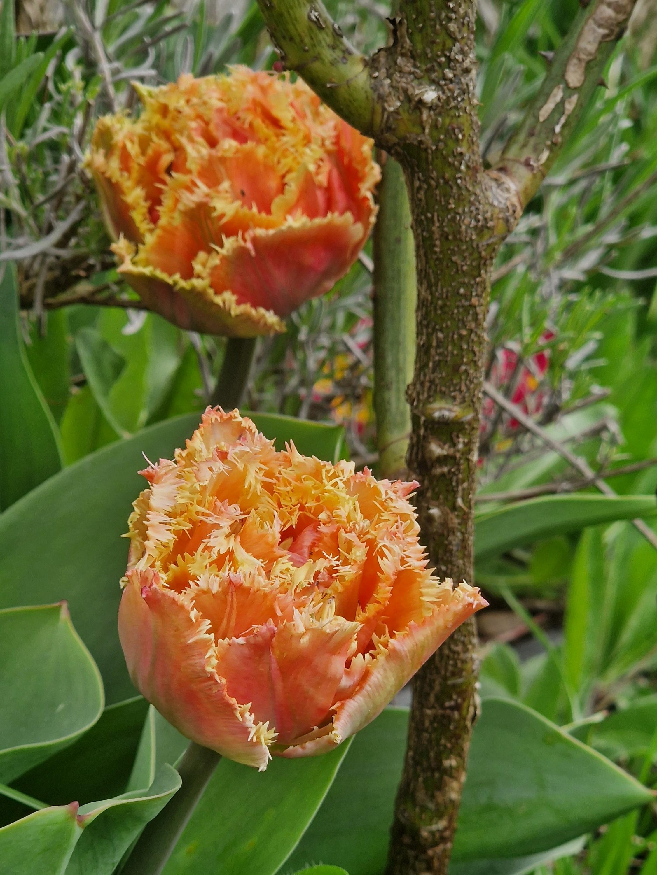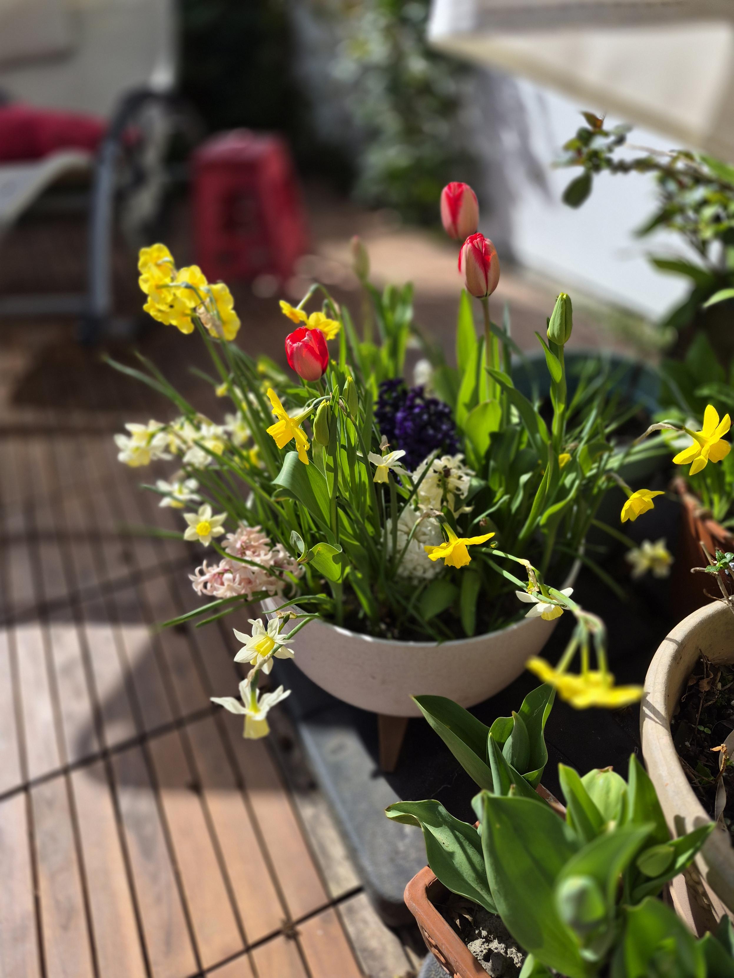 Eine meiner besten Ideen war, die erst im März beim Aufräumen entdeckten 5 Packungen Blumenzwiebelmix einfach alle gemeinsam in einen großen Topf mit Erde zu werfen. Ich habe nichts davon erwartet, und jetzt sind sie das Highlight auf der Terrasse.