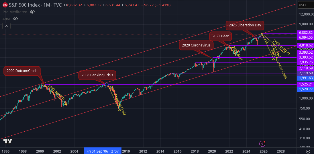 You'd be looking at 25 to 50 percent drop over a year or three, taking S&P index down to four to five thousand or so over 2026, since that's what they were.
