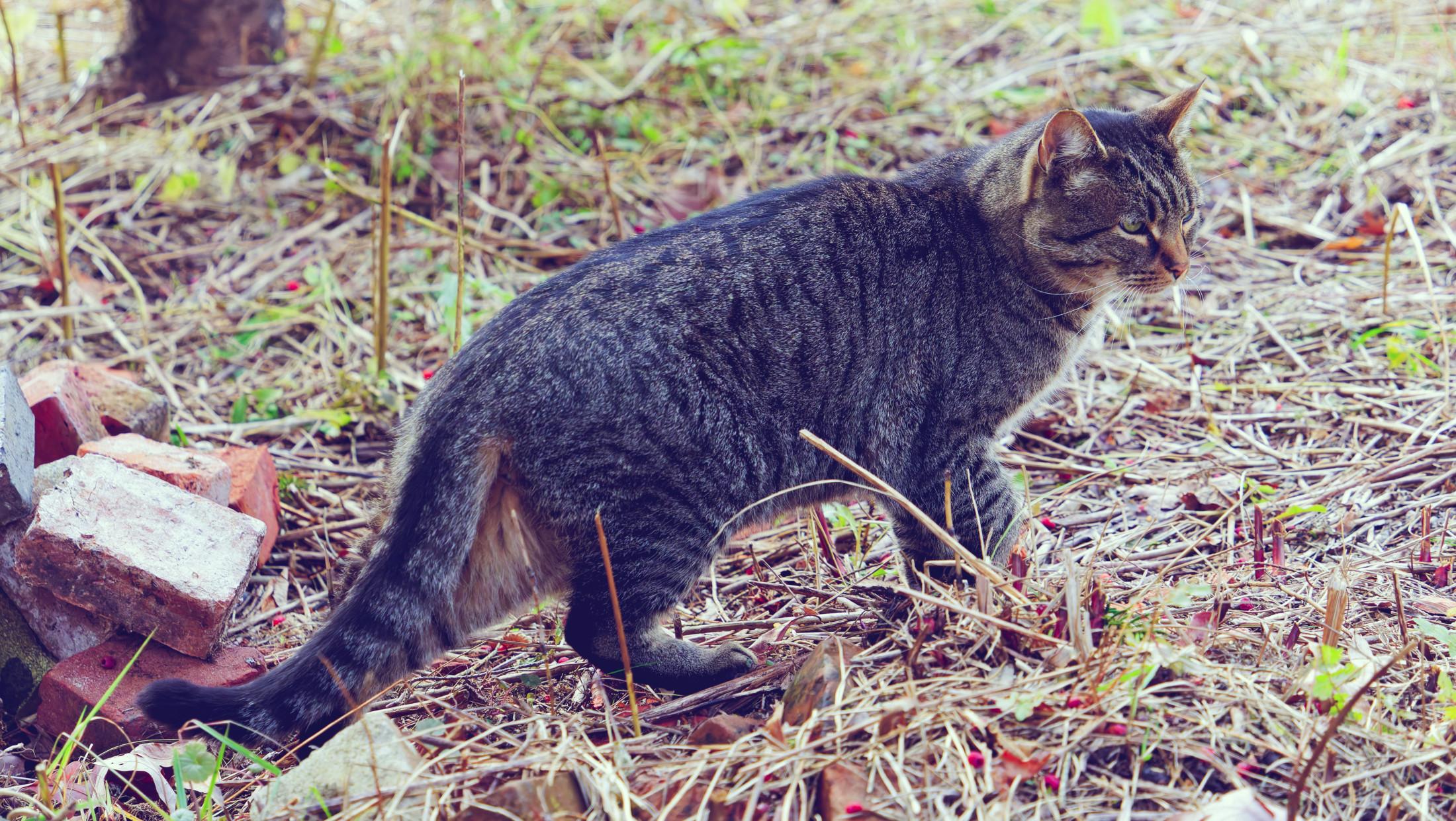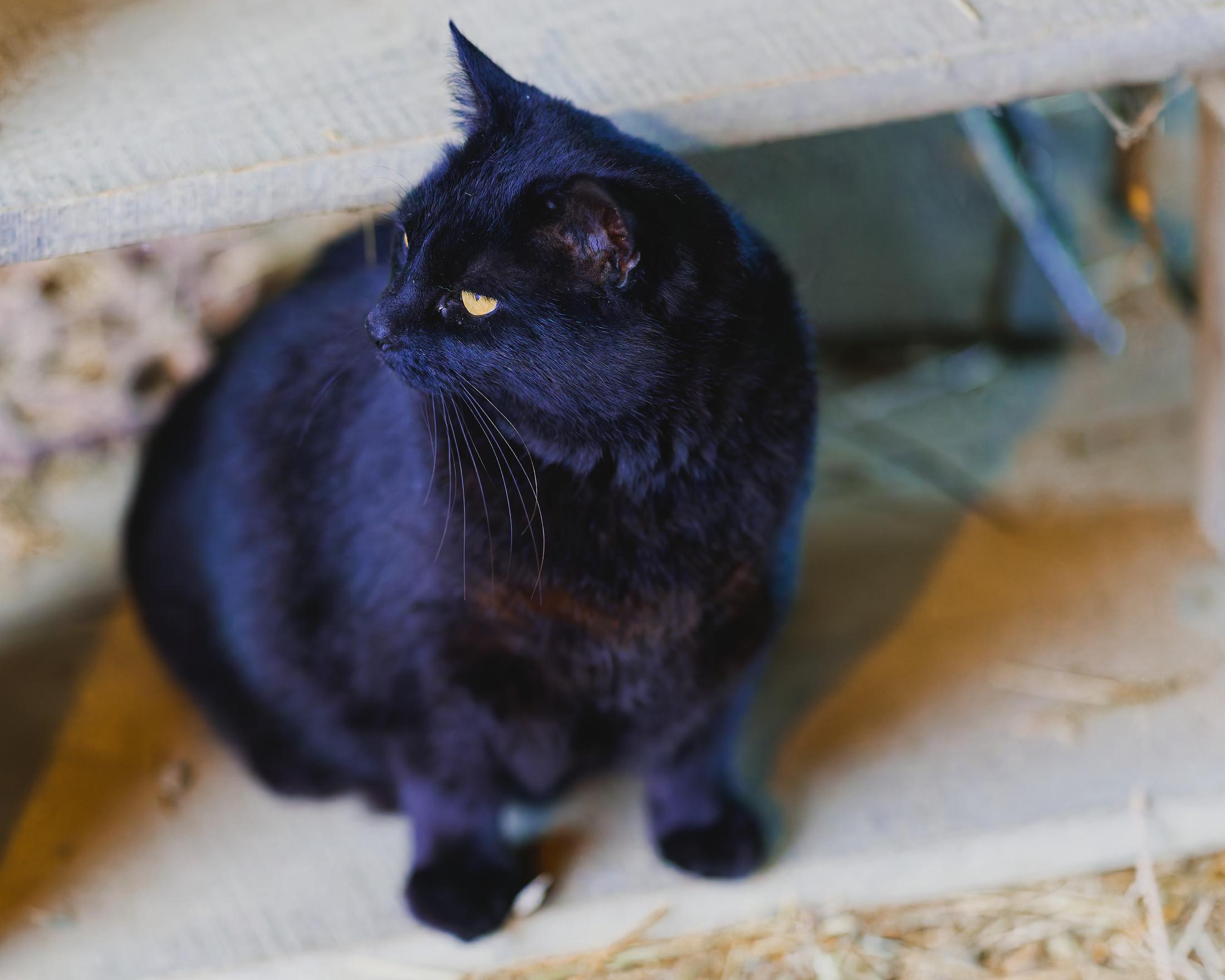 Our longstanding barn cat Queen Jane on the straw and grass out in front of our barn