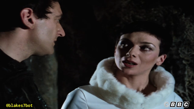 SERVALAN: Right. [Travis moves off - Servalan looks uneasy as she hears various 'roars' from the tunnels.] Travis! Travis!! [Suddenly a clawed hand is placed on her leg.] Agh!! Travis! Travis, help me! [Travis shoots the creature. Servalan is shaking]