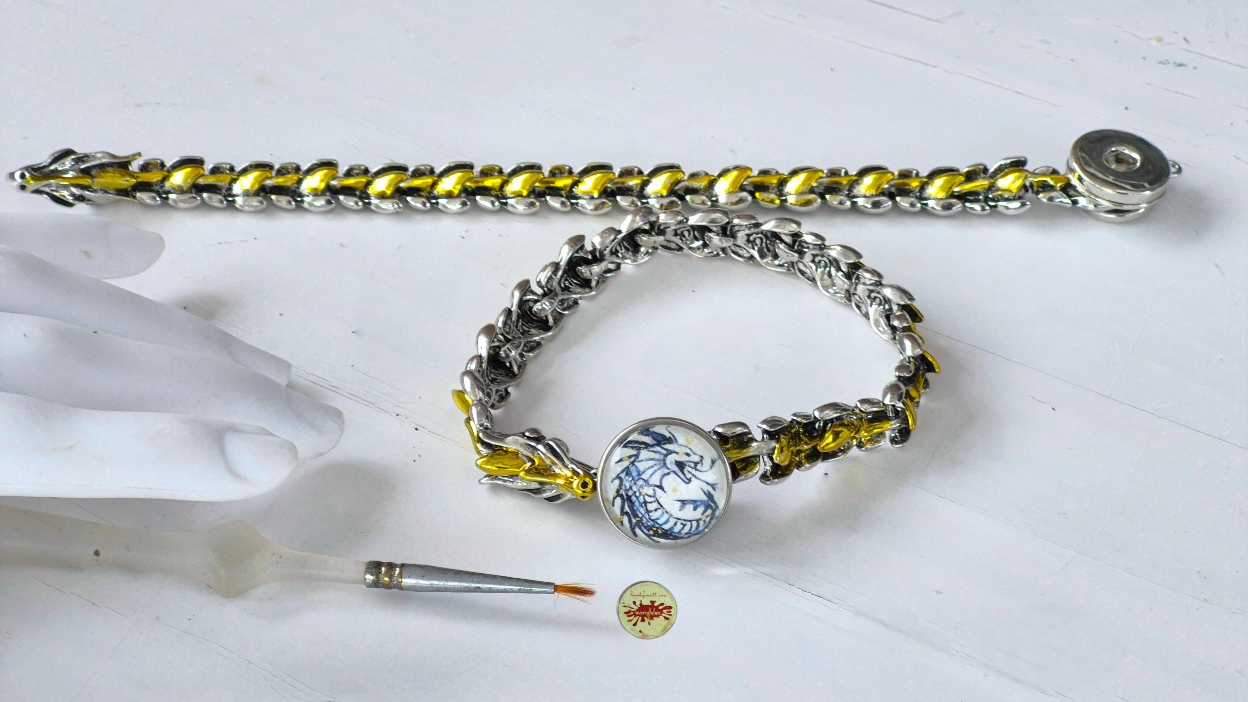 Der große Drache von gestern zog schon weiter, aber ich hab noch Mini-Drachen to go zur Hand: auf 20mm handgemalter #wandklexschmuck auf Drachenschuppen-Armband. (Druckknopfwechselsystem, kompatibel mit allm meinen anderen Druckknopfkunststückchen) auf #miniaturepainting #art #artShop #fediArt #mastoArt #creativeToots #artForSale