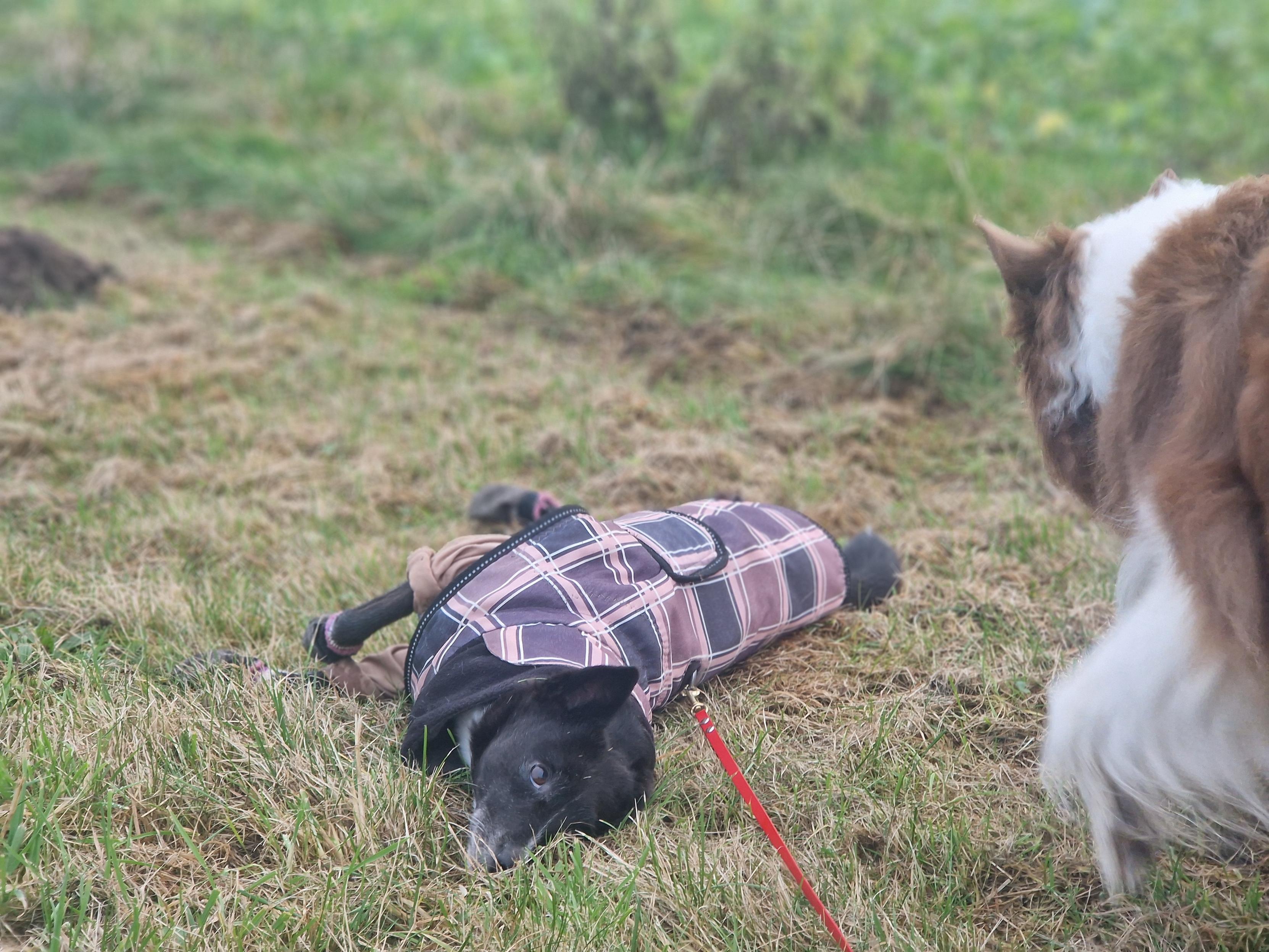 Frau #Atelierhütehund hatte wohl heute auch ihren Spaß mit Amy . 😁 zum sich selber wälzen sind die Knochen schon zu alt, daher lässt sie wälzen. 😁