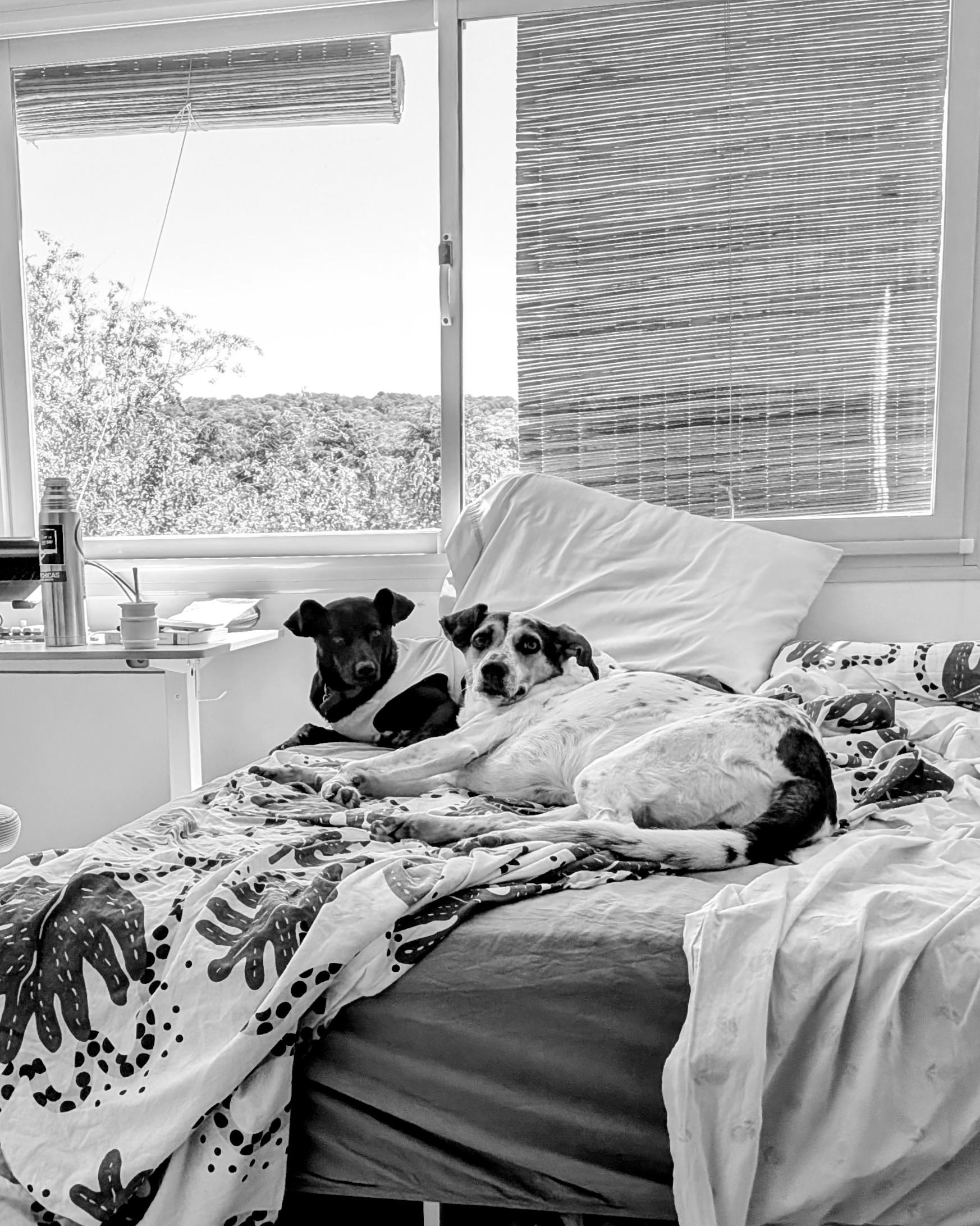 Our wonderful dog, Izzy (the brown and white dog) was taken to a shelter in March 2020 with four very young puppies. One, Star (the black and white dog), lives nearby and he and his human often stop by on their walks. Even after 5 1/2 years, Izzy gets more excited to see Star than any other dog or person, except maybe me. #MonDog