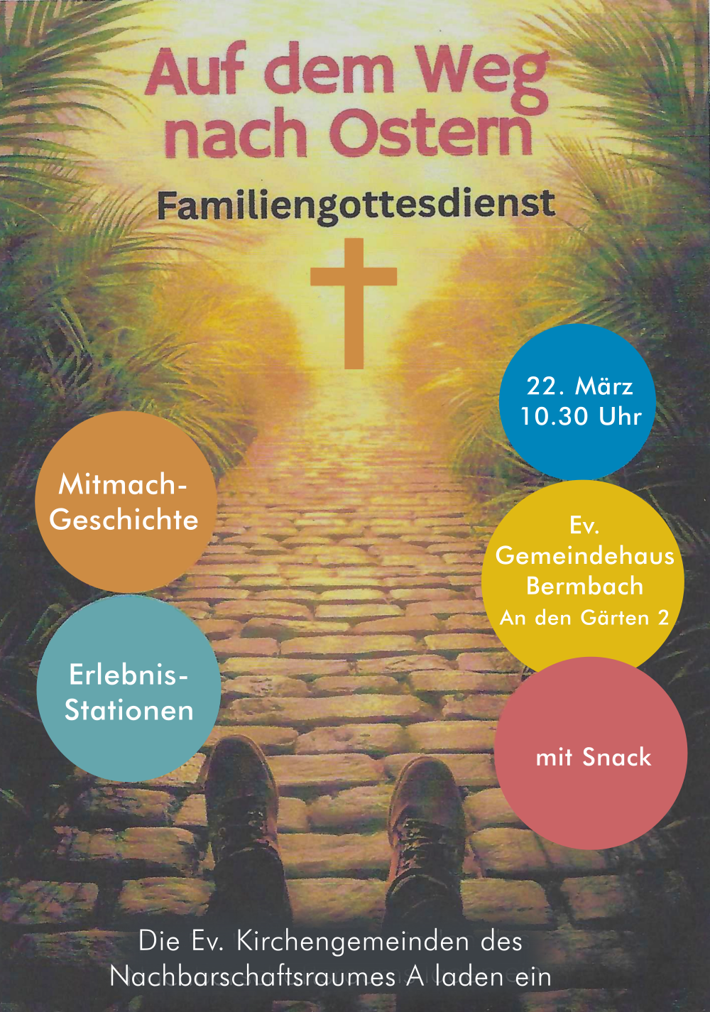 Flyer zum Famileinegottesdienst: Bild - Blick von oben auf Schuhe auf einem geplasterten Weg in den Sonnenschein, seitlich Palmwedel; Text: Auf dem Weg nach Ostern / Familiengottesdienst, Ein Kreuz auf der Sonne; bunte Blasen mit Text: Mitmachgeschichte / Erlebnis-Stationen / 22. März, 10.30 Uhr / Ev. Gemeindehaus Bermach, an den Gärten 2 / mit Snack