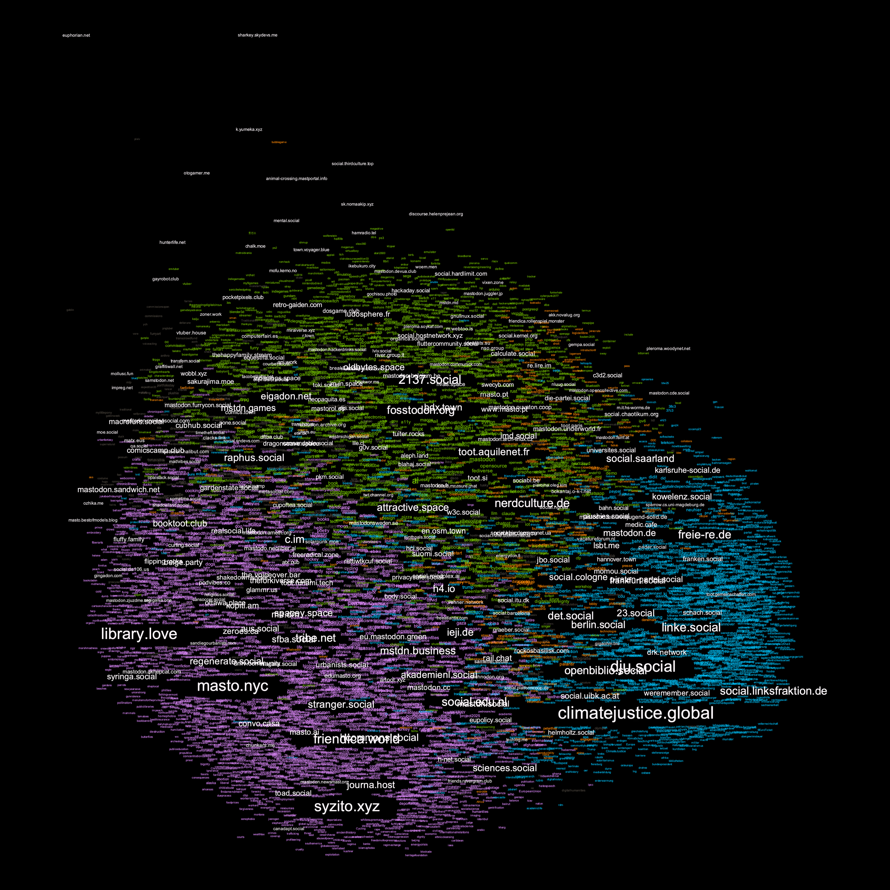 294 #fediverse instances with 128 k hashtags in their most recent 4 k posts. Reduced to 6 k hashtags that were used at least twice. Color by modularity groups, size by in/out degree splined.