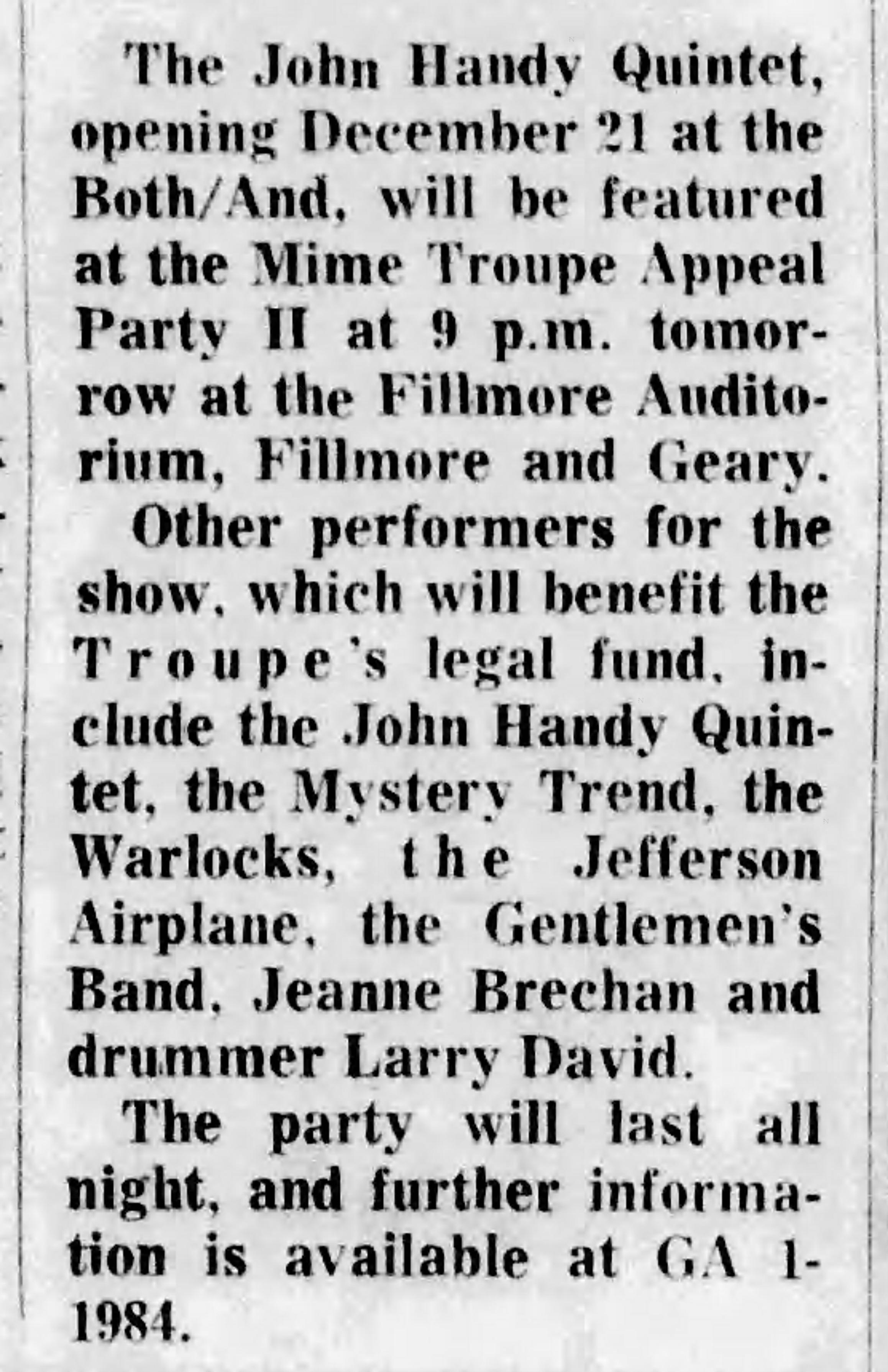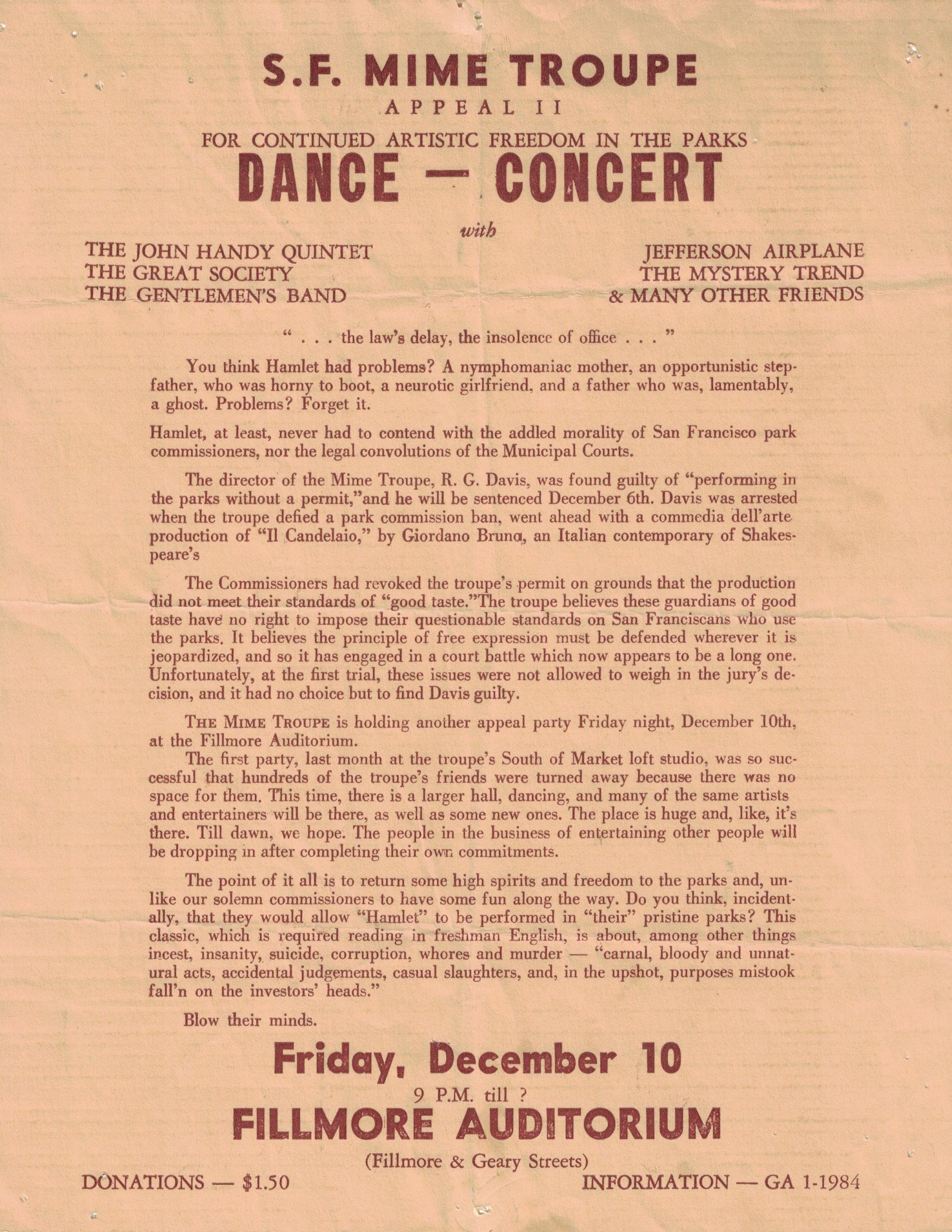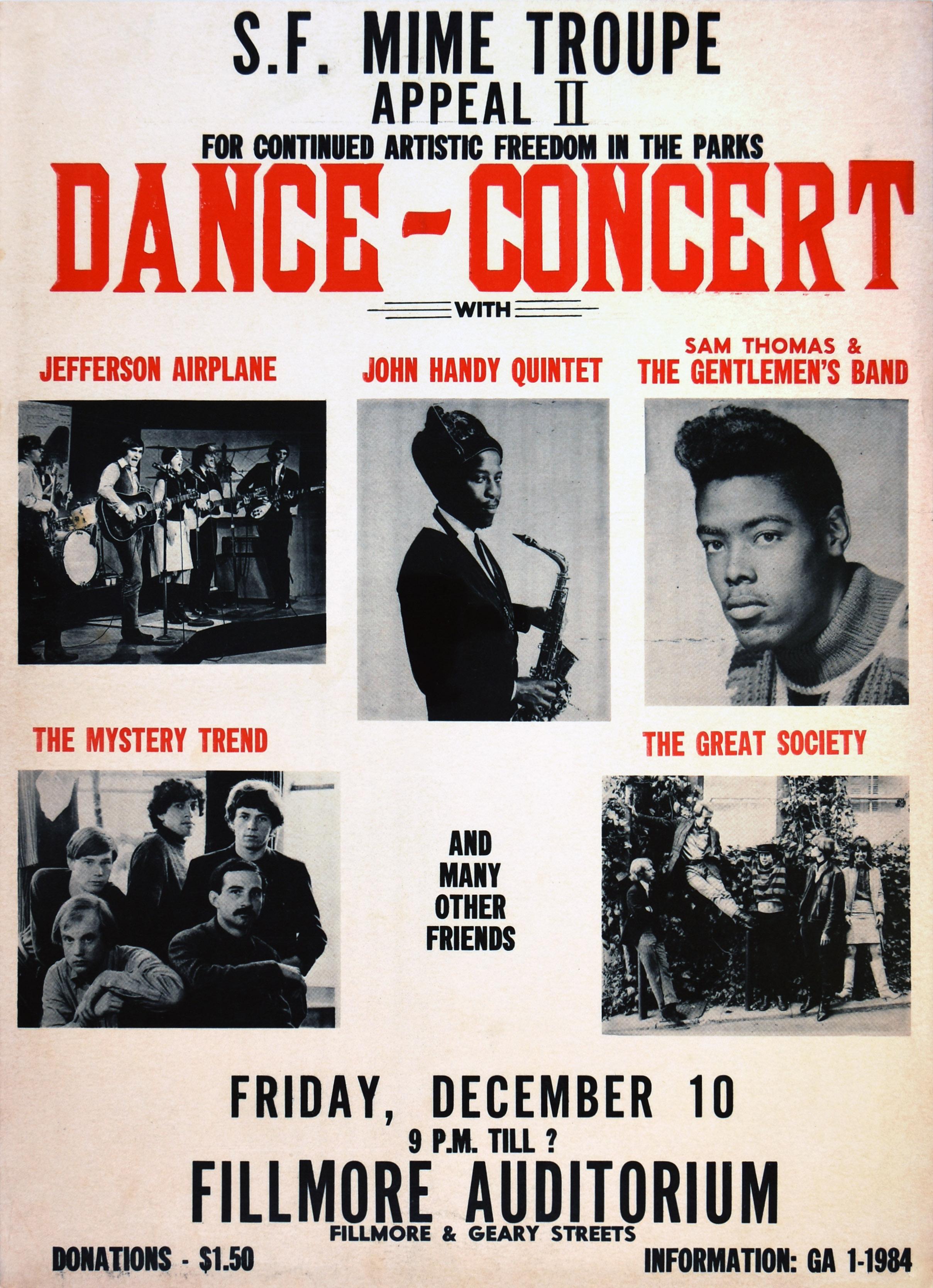60 years ago tonight, the #GratefulDead (& bill graham's) 1st fillmore auditorium gig, at the #sanfrancisco mime troupe’s appeal II, maybe the 1st actual time the dead name was used. not in ads (“formerly the warlocks” was january), no tape.