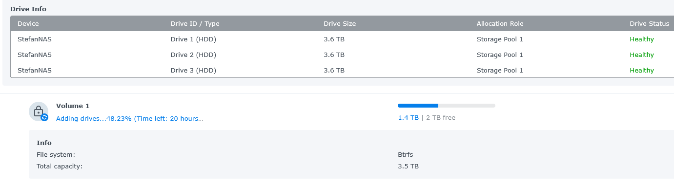 Trying to add a 3rd drive my my NAS volume and it has said it will take about 24 hours for the last 12 hours.
