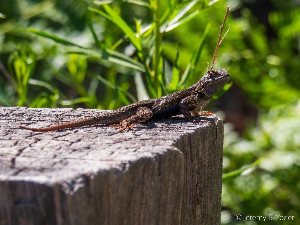 A western fence lizard, Sceloporus occidentalis, perched on a fence post, along the trail in Yosemite Valley this spring