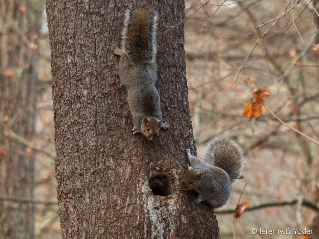 Eastern gray squirrels, Sciurus carolinensis, apparently sharing a nest-hole in the wintery woods near Acton, Massachusetts