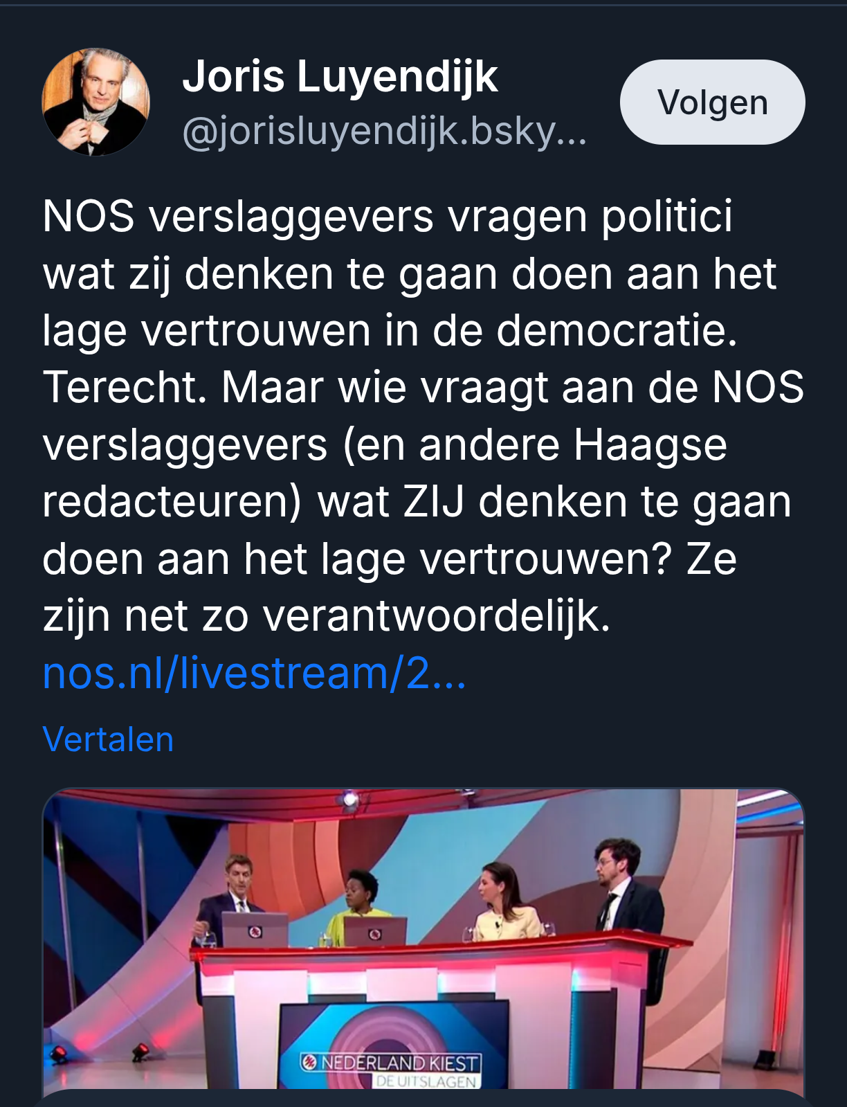 Terechte vraag van Joris Luyendijk aan de NOS (en andere media trouwens). Wat ik eigenlijk compleet mistte is de kans die de NOS had om hun samenwerking met lokale omroepen 'uit te buiten'. Wie zijn immers het best in staat om kiezers te informeren over lokale politiek? #politiek#NOS
