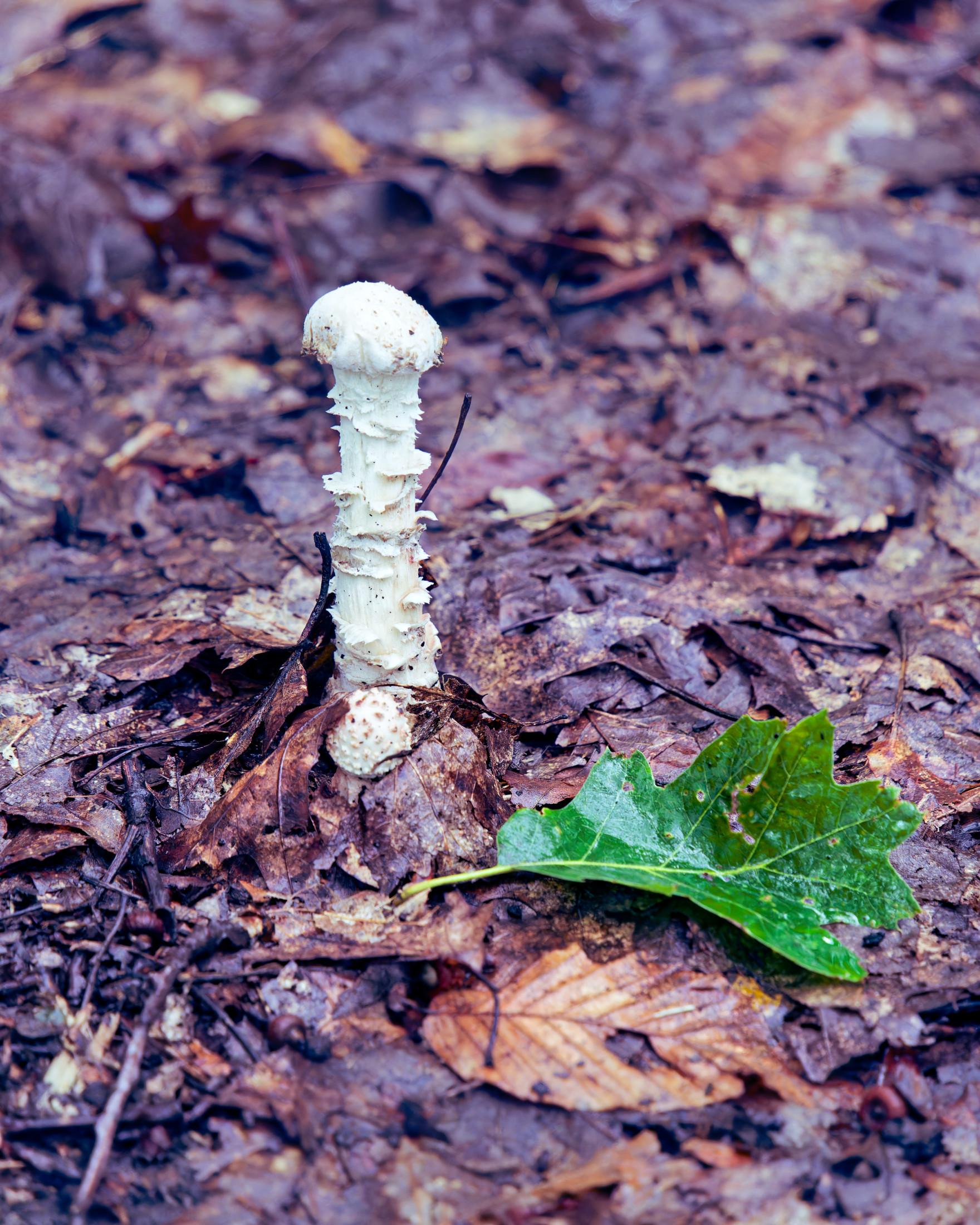 White phallic fungus rises out of leaf little on forest floor with one fresh green oak leaf next to it