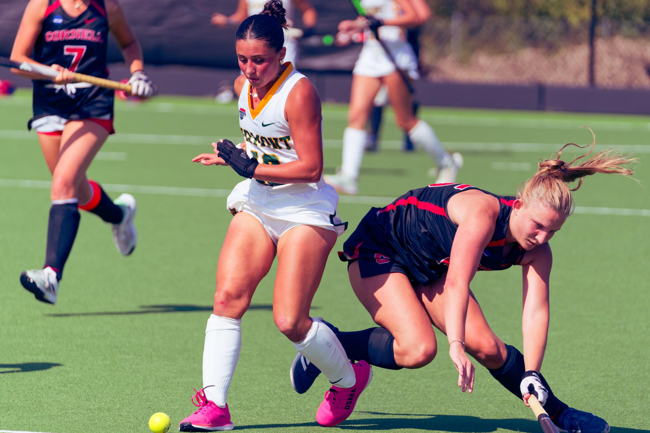 Field hockey at the new Martha Dodson Field out past the East Hill Plaza -- Cornell Beat Vermont 3-1 in front of the largest crowd I've ever seen at a field hockey game. In the center are № 8 Ashley Plzak of the Big Red and № 15 Sophia Lefranc of the Catamounts, who won the US East Conference in 2024