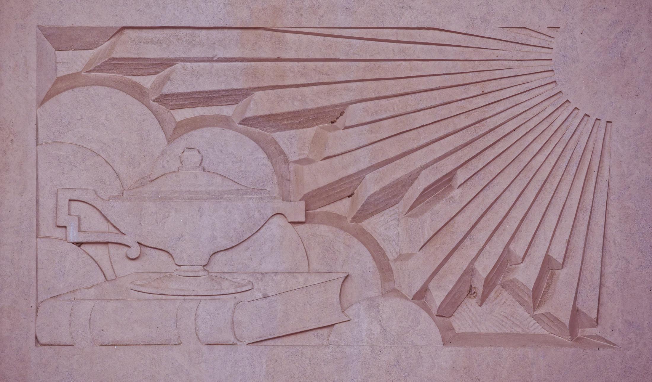 Relief sculpture of rays of sunlight, a book, clouds and the kind of lamp that a genie lives in from the Newark Valley Central School