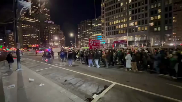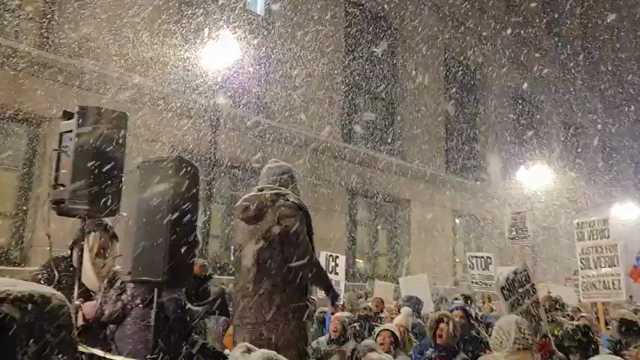 Protesters chant "I believe that we will win!" in front of Chicago's city hall in the snow (Chicago, IL - 1/30/26)