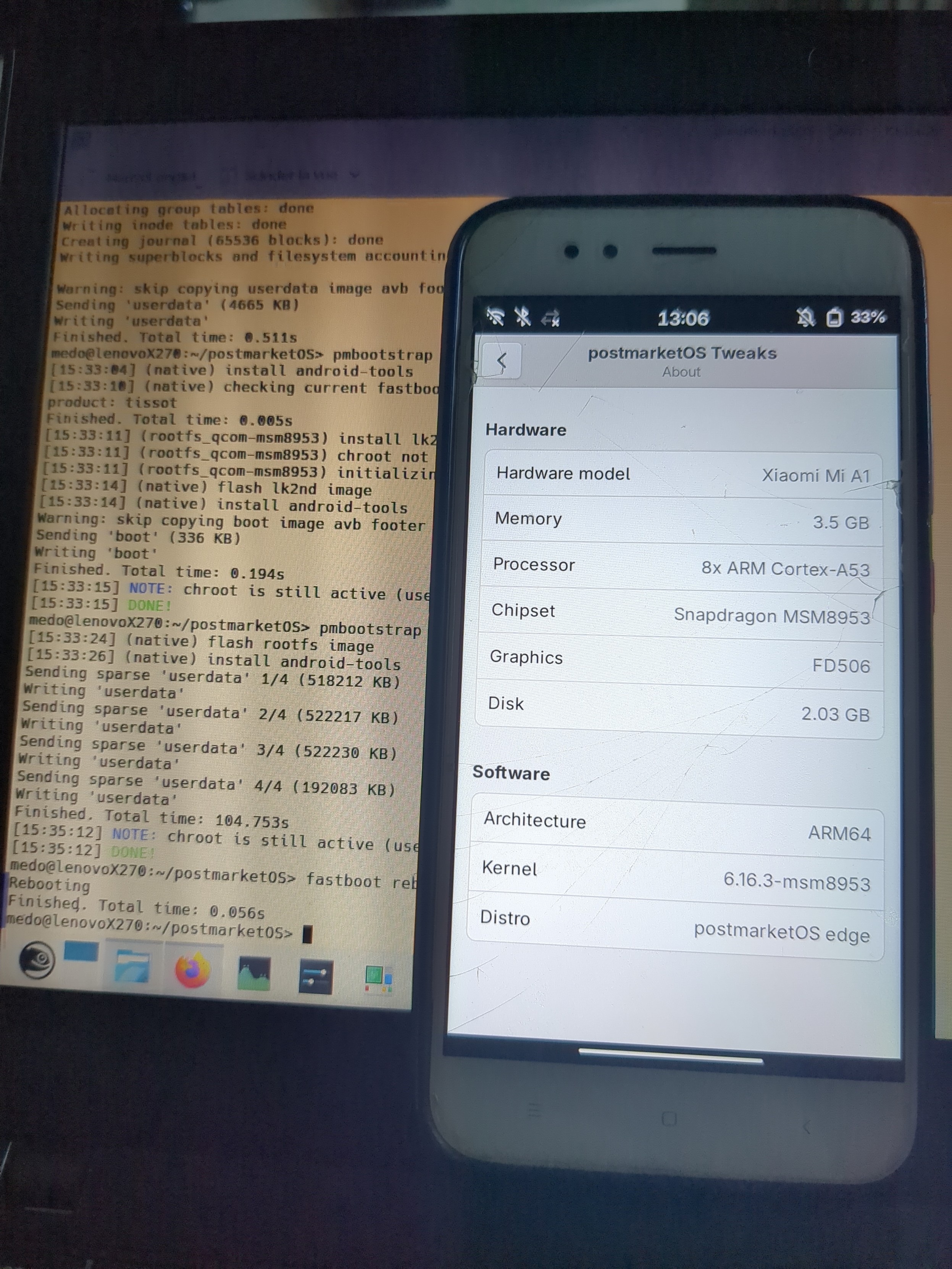 Success ! Failed the first time but it works now. #postmarketos with #phosh on the pretty old Xiaomi A1 that I do not use anymore.