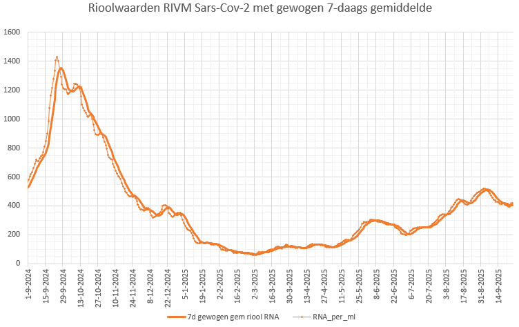 Met de afgelopen week in de rioolcijfers een lichte daling, die inmiddels alweer tot stilstand lijkt te zijn gekomen. Het virusniveau blijft relatief hoog, boven de 400, maar een stijging is zeker niet te zien in deze cijfers.
