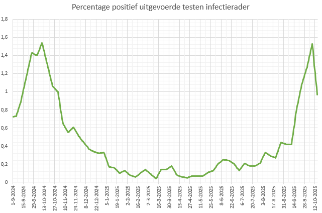 Ik begin vandaag met het percentage positief, omdat dat opnieuw fors gestegen is en inmiddels vrijwel even hoog is als de top van de herfstgolf in 2024.