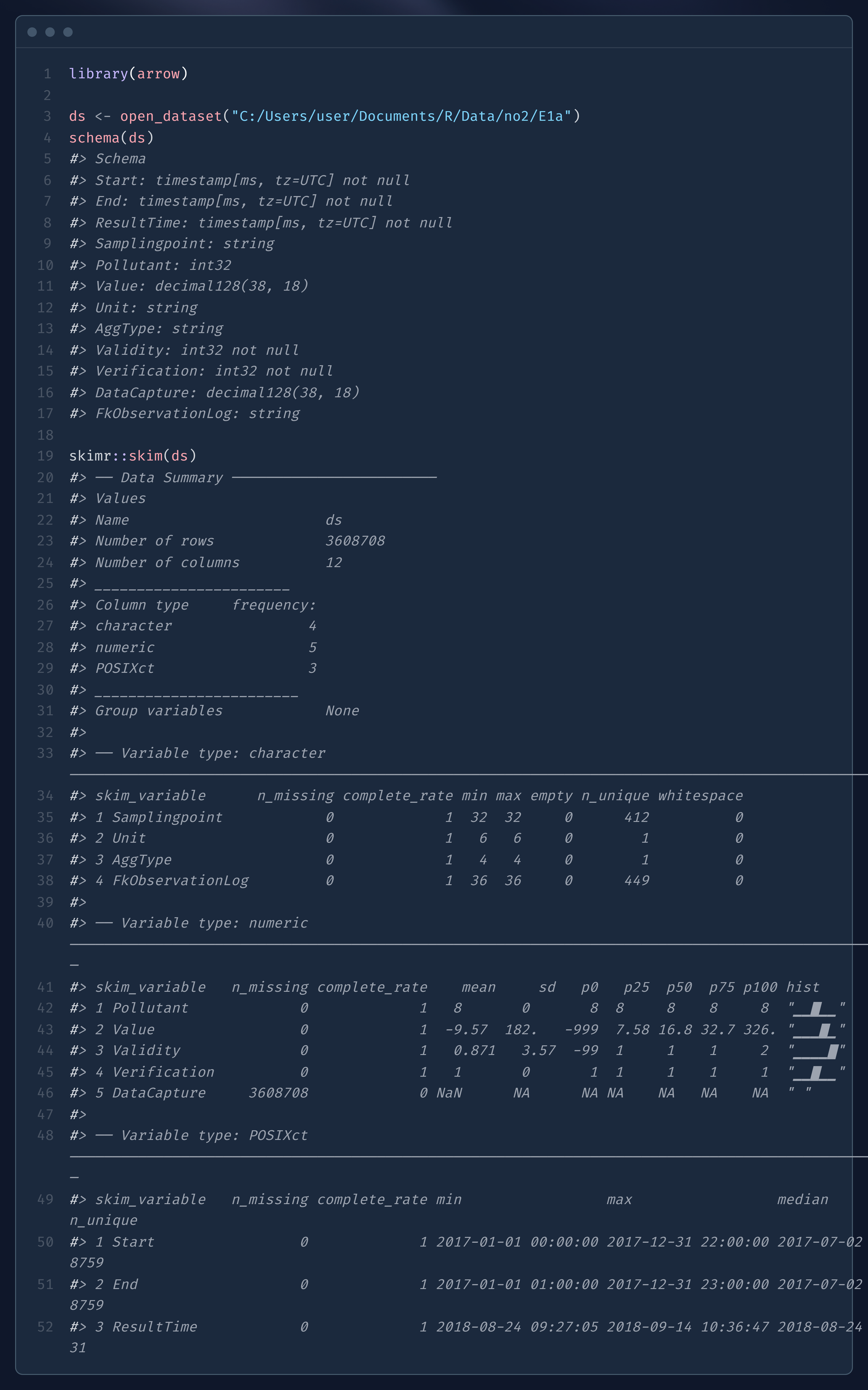 Didn't know that {skimr::skim} worked an arrow object. It's pretty cool, but it hits your RAM pretty hard. That's only a 70MB directory of parquet files, and my RAM usage went up by ~1.3GB. #RStats Code: https://ray.so/fCoXwso