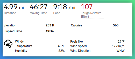 More reasonable distance today, better weather, meh AQI. Hoping to get in a few more runs in this week. Dropping some medications, so far it has helped a bit in some areas of #longfcovid recovery.