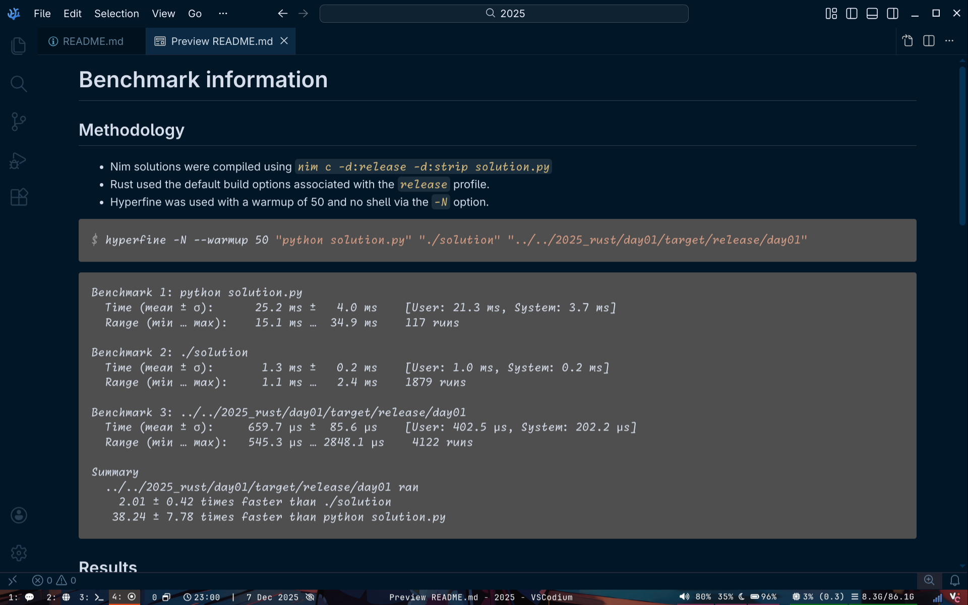 A quick comparison using `hyperfine` for some benchmarking on the #adventofcode 2025 Day 1 solution. Not too shabby for any of the solutions, and its interesting to compare them.