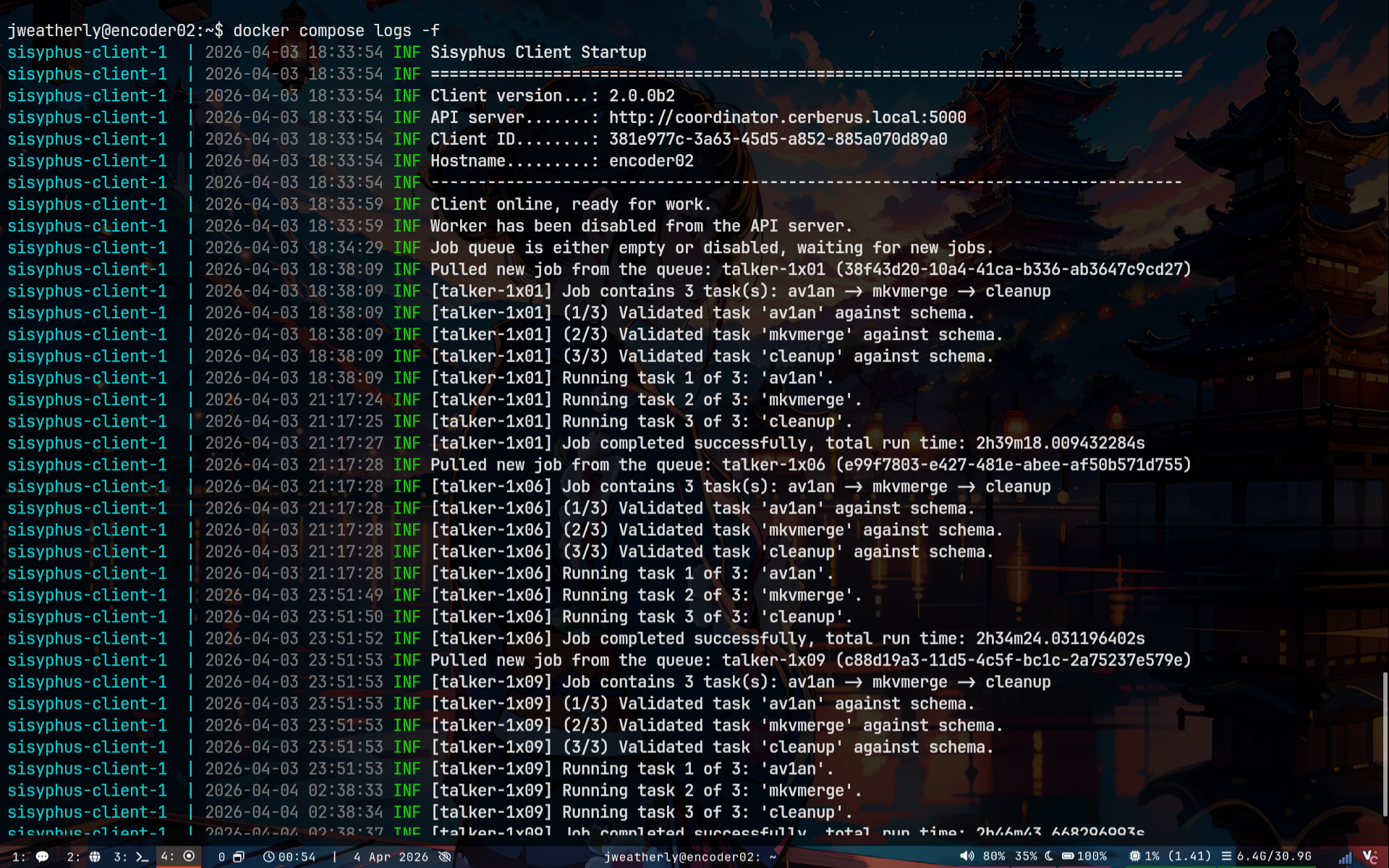 The long test is looking good for the `av1an`, `mkvmerge`, and `cleanup` modules, the Golang client is doing exactly what its supposed to which is a welcome change from yesterday. I need to do long tests on the `ffmpeg` and `handbrake` modules next, but I'll handle those tomorrow.