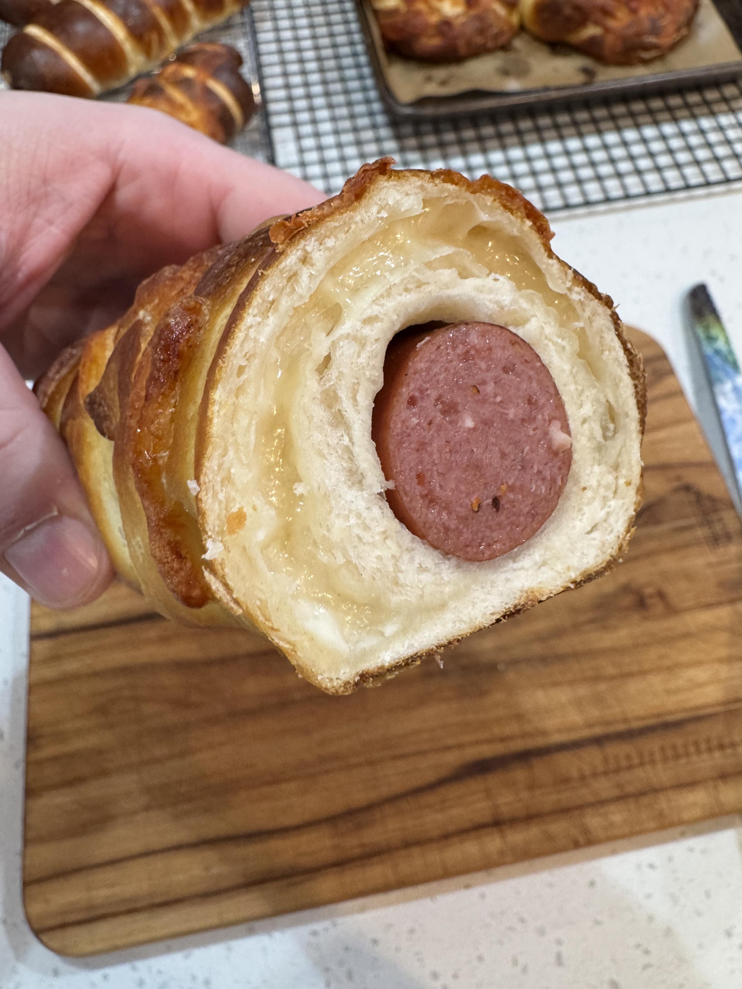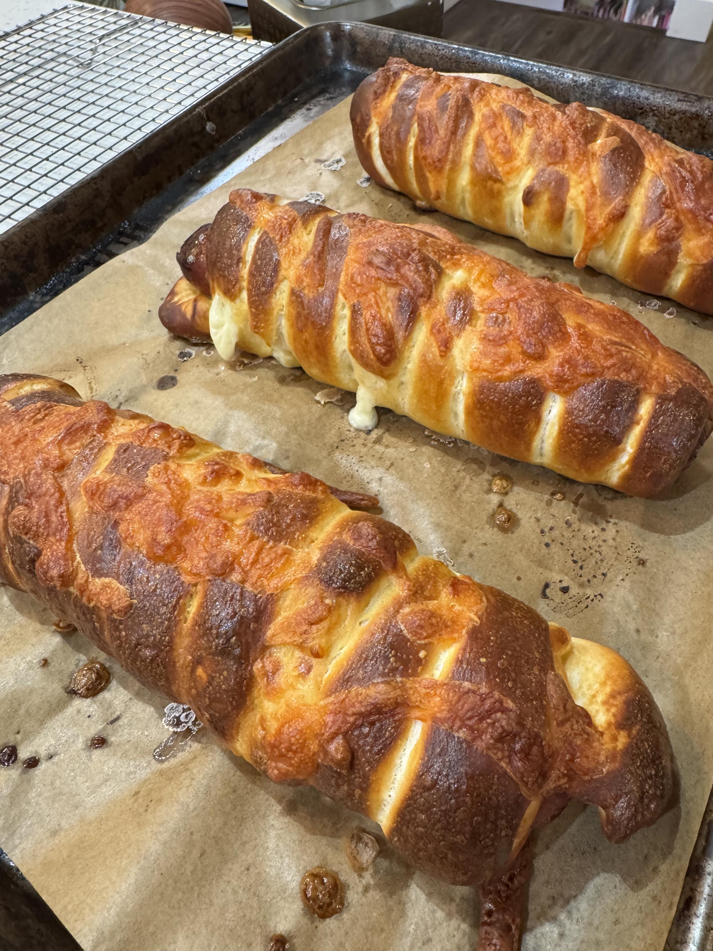 In tonight's #sourdough science - we did cheese covered pretzel dogs before - but this time we tried for *stuffed*