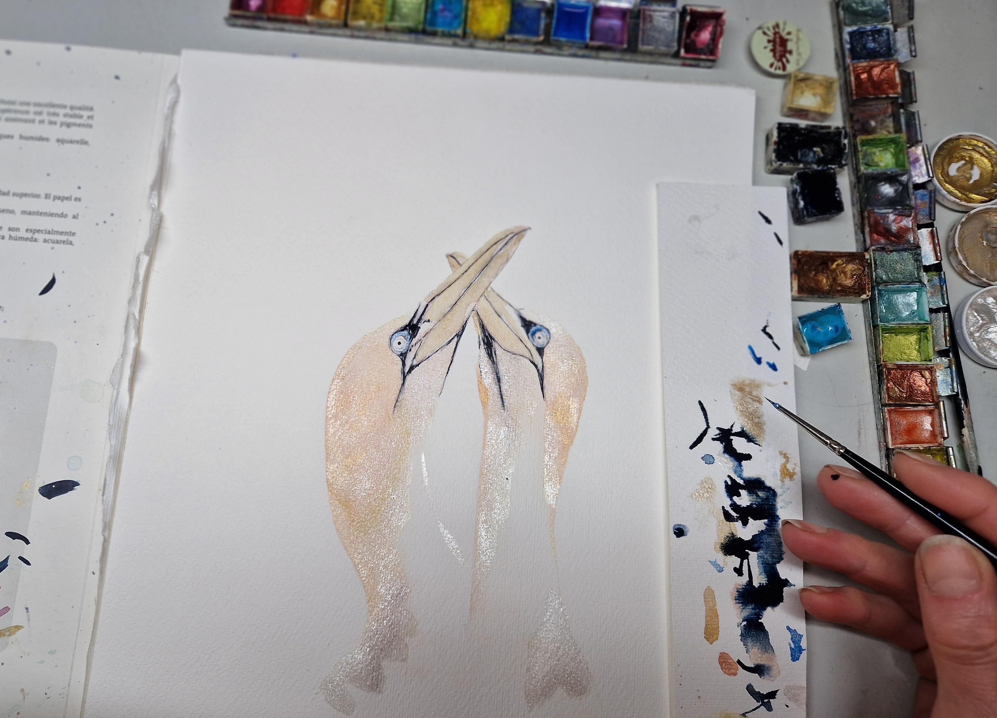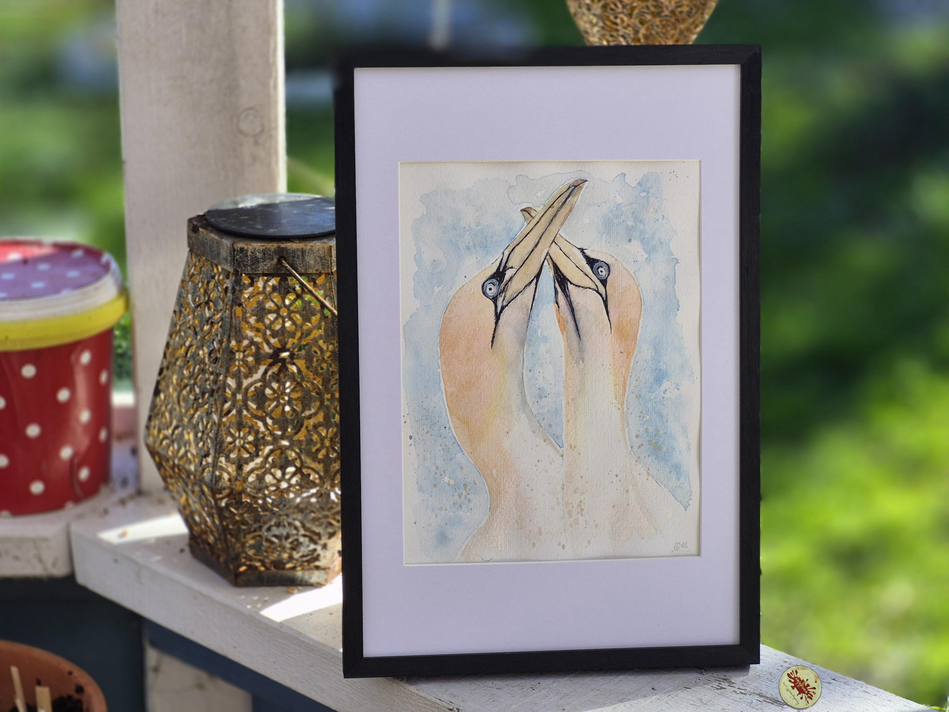 Die beiden sind eben im Original in den #wandklex Shop gekommen und auf #birds #watercolor #watercolour #aquarell #art #artShop #fediart #mastoart #creativeToots #artforsale #gannet #helgoland