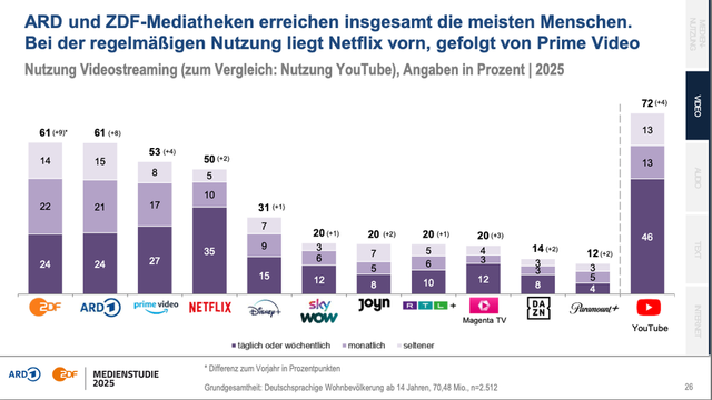 Mit 72 Prozent ist #YouTube auch 2025 meistgenutzte Videoplattform der Menschen in Deutschland ab 14 Jahren. Die ÖRR #Mediatheken von ARD und ZDF liegen auf dem zweiten Platz und erreichen über 60 Prozent der Bevölkerung. Knapp dahinter folgen mit einem gewissen Abstand Netflix und Amazon Prime …